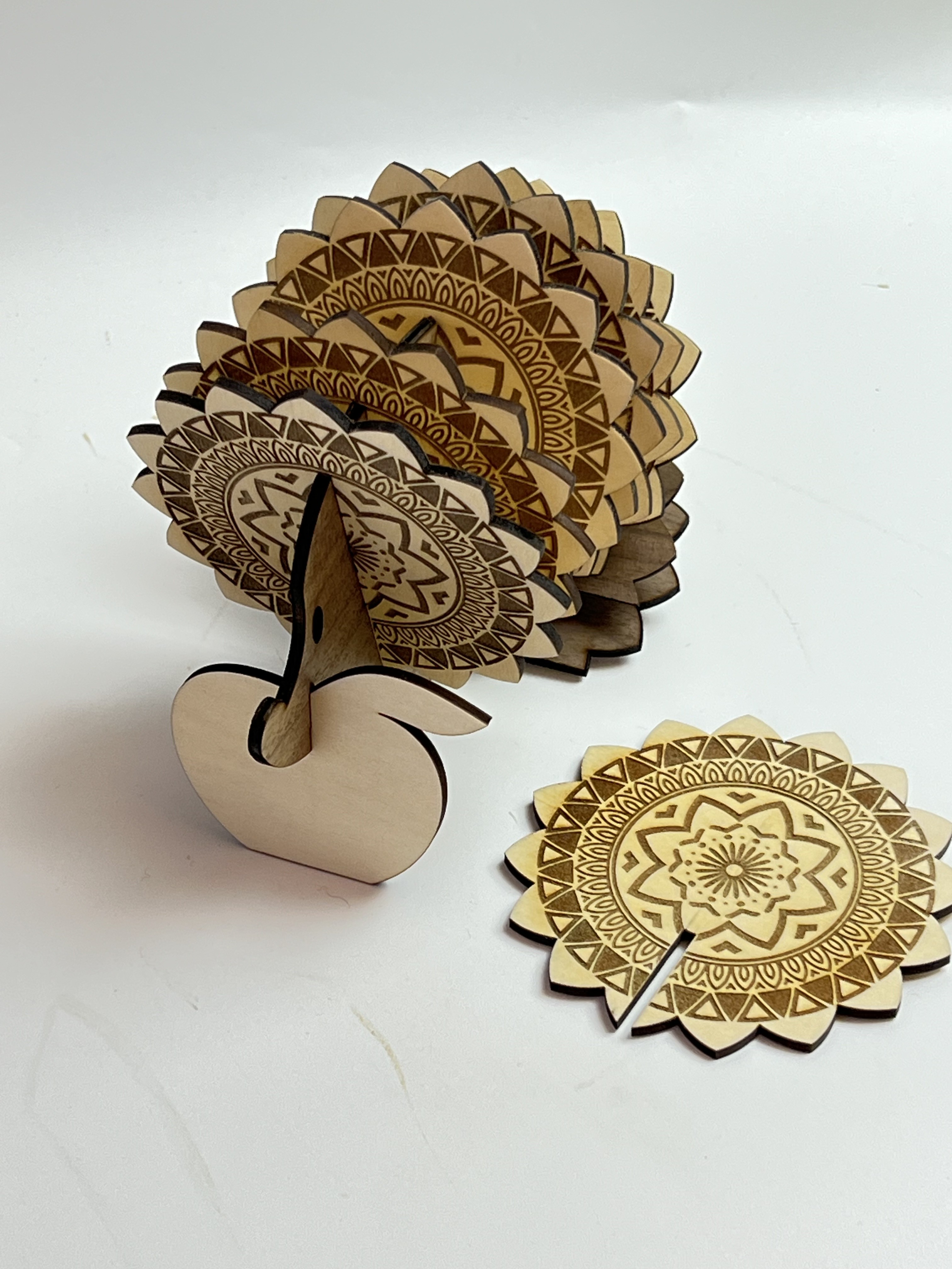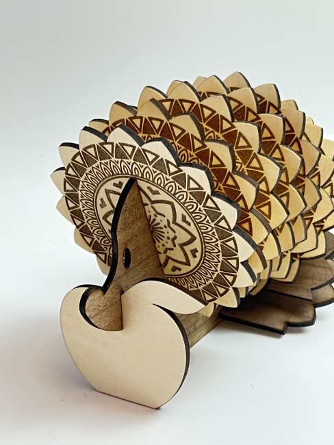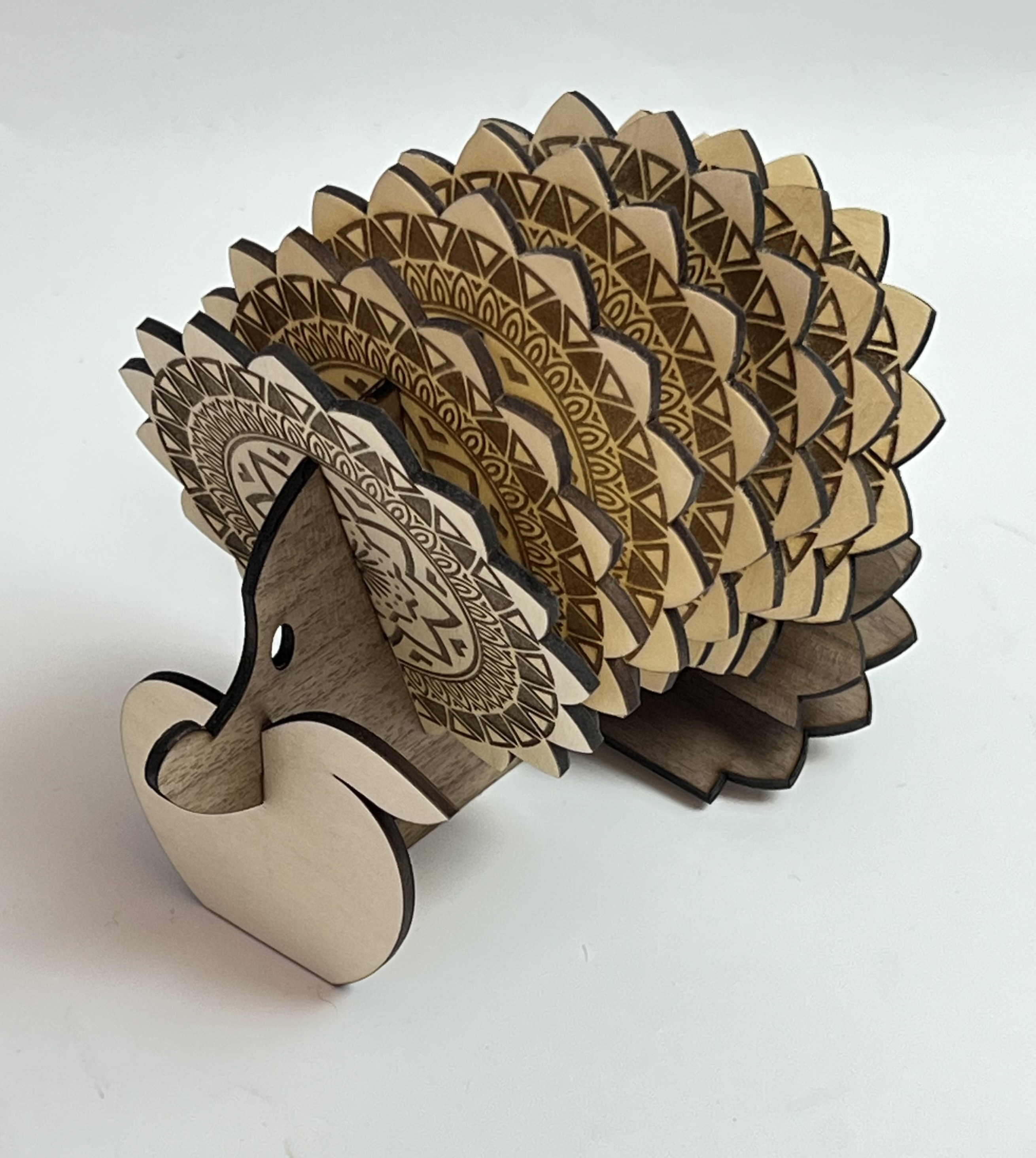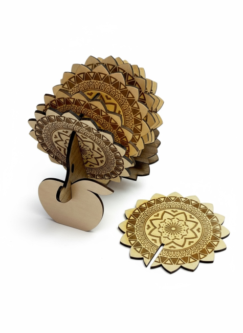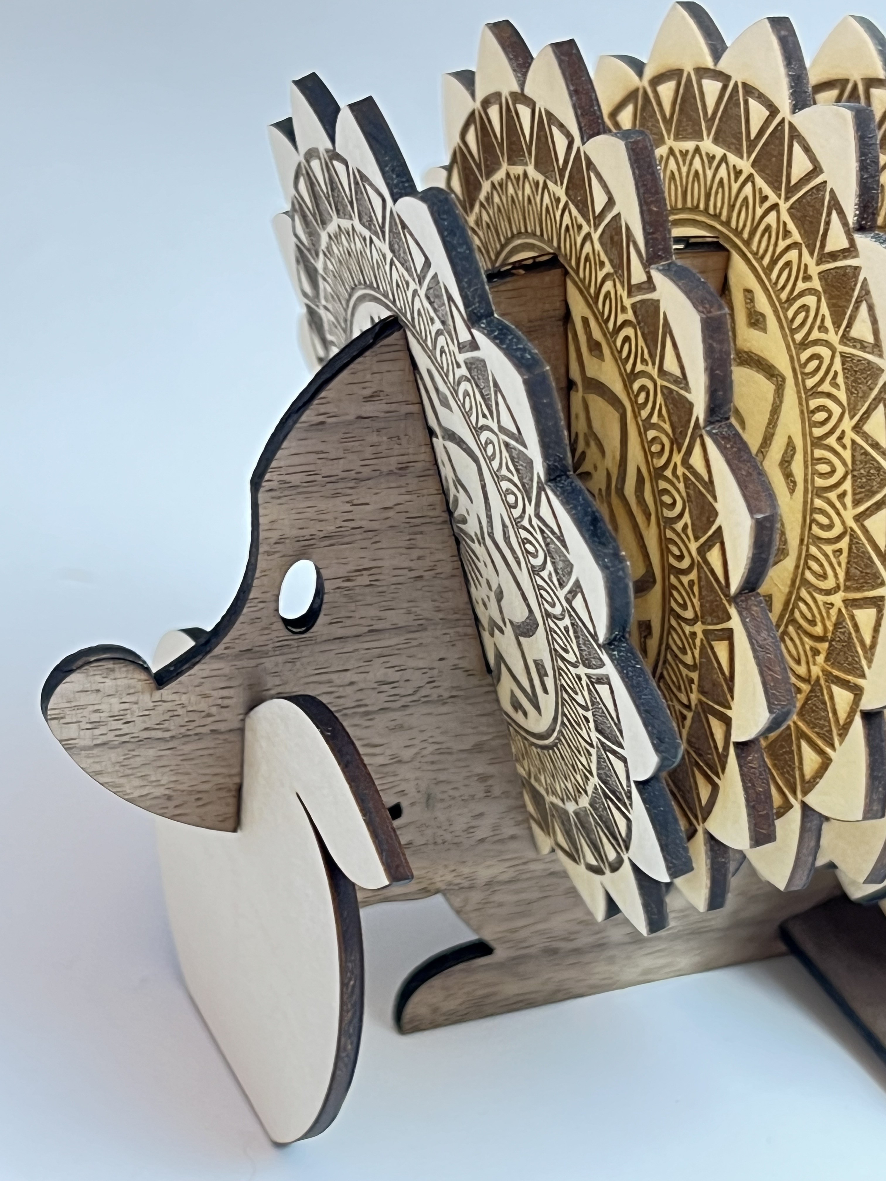 Surprenez vos proches avec cette idée cadeau originale et artisanale : un support de 7 dessous de verre en bois, gravés et coupés avec soin dans notre atelier. Lorsqu'ils sont rangés sur leur support, ces dessous de verre forment une adorable silhouette de hérisson tenant une pomme entre ses dents. Chaque dessous de verre est orné d'un magnifique mandala gravé sur une seule face, ajoutant une touche artistique et unique.