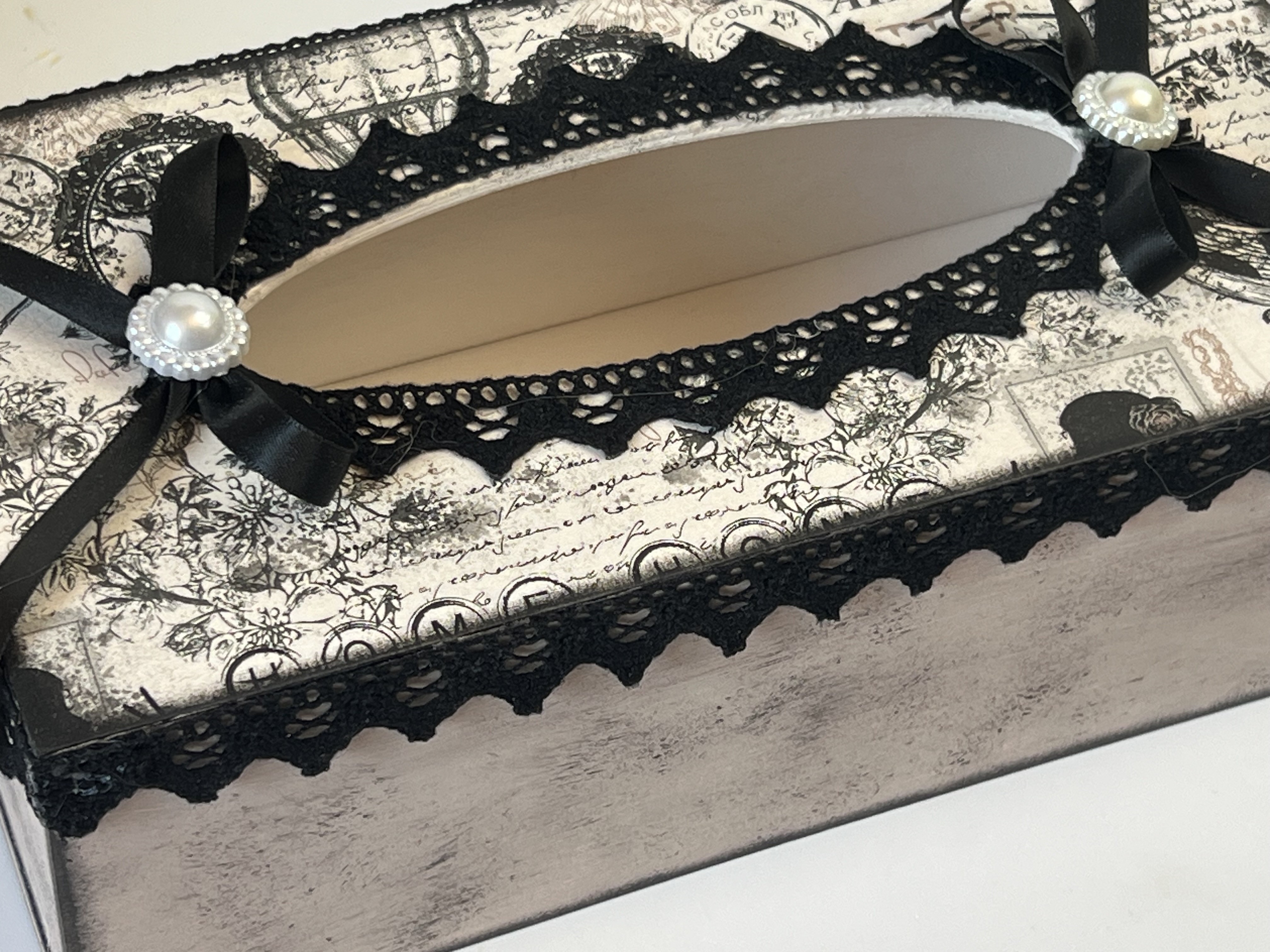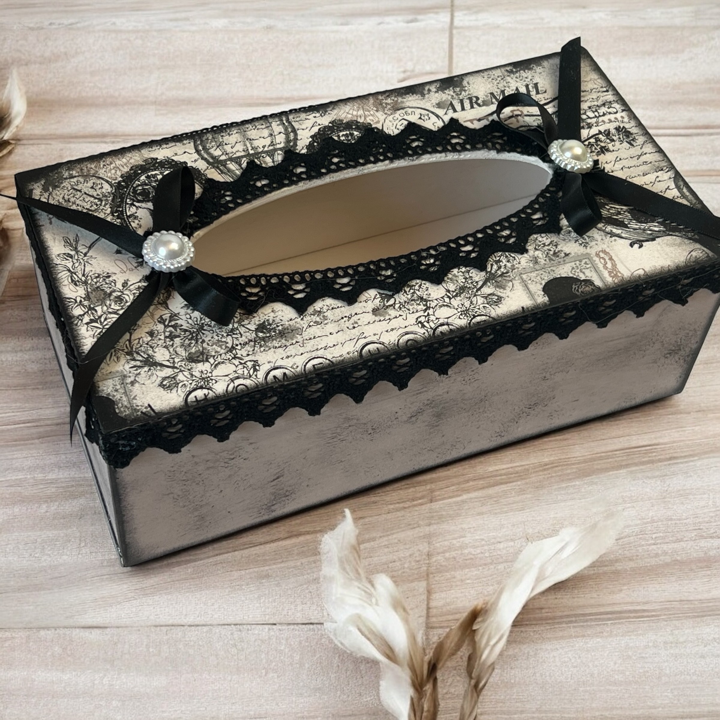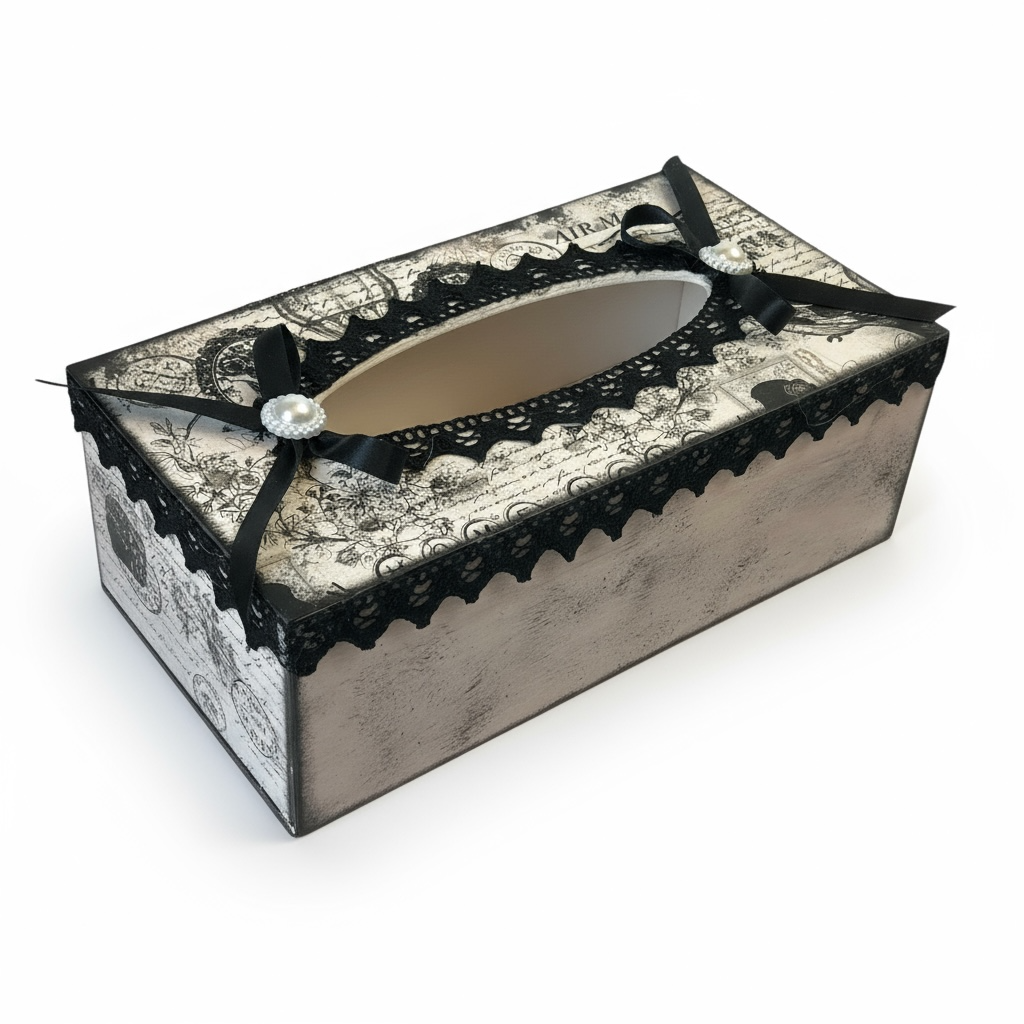 - Le pourtour et le dessus de la boîte sont ornés de dentelle noire délicate, ajoutant une touche de sophistication et de mystère.
