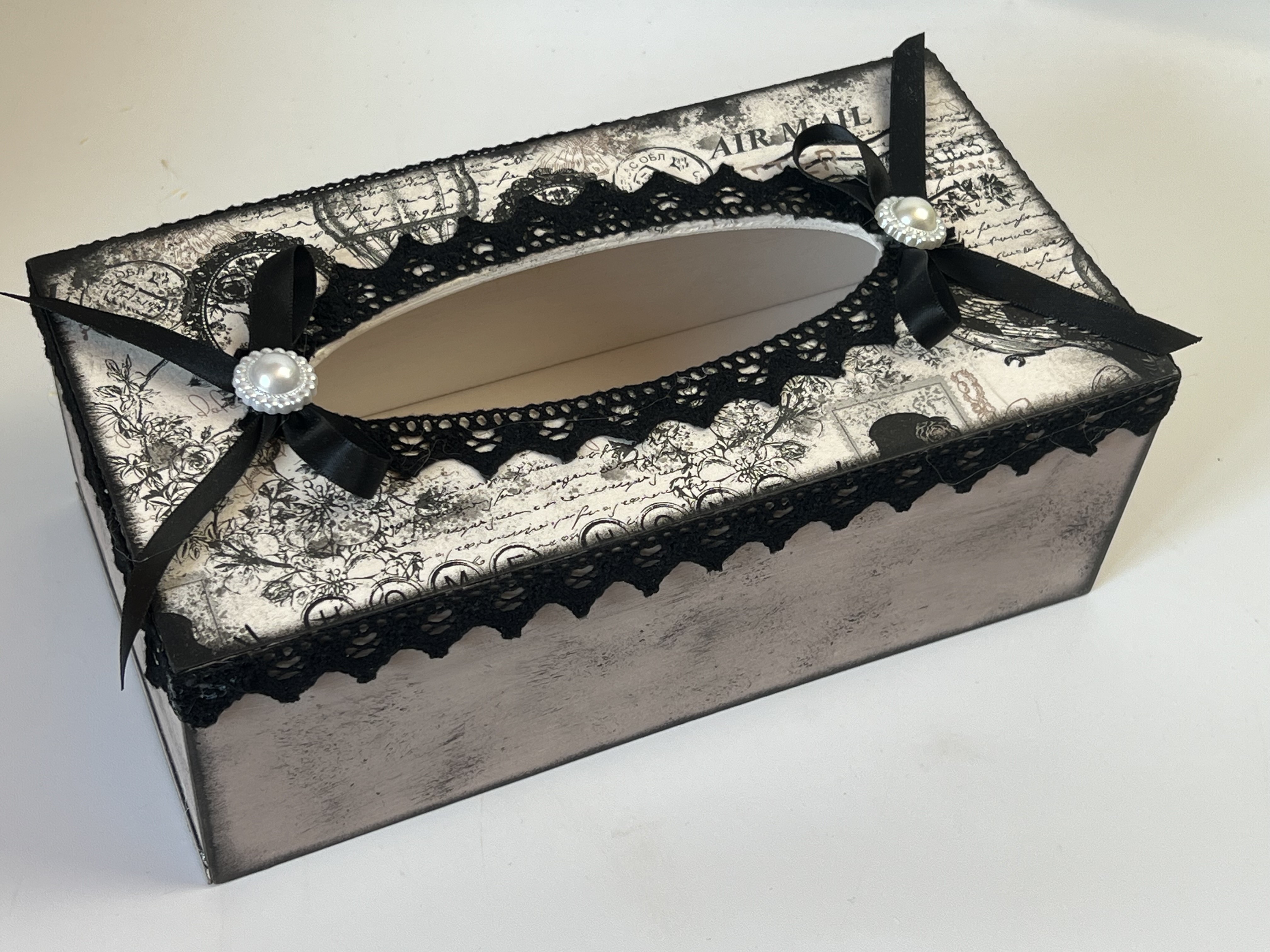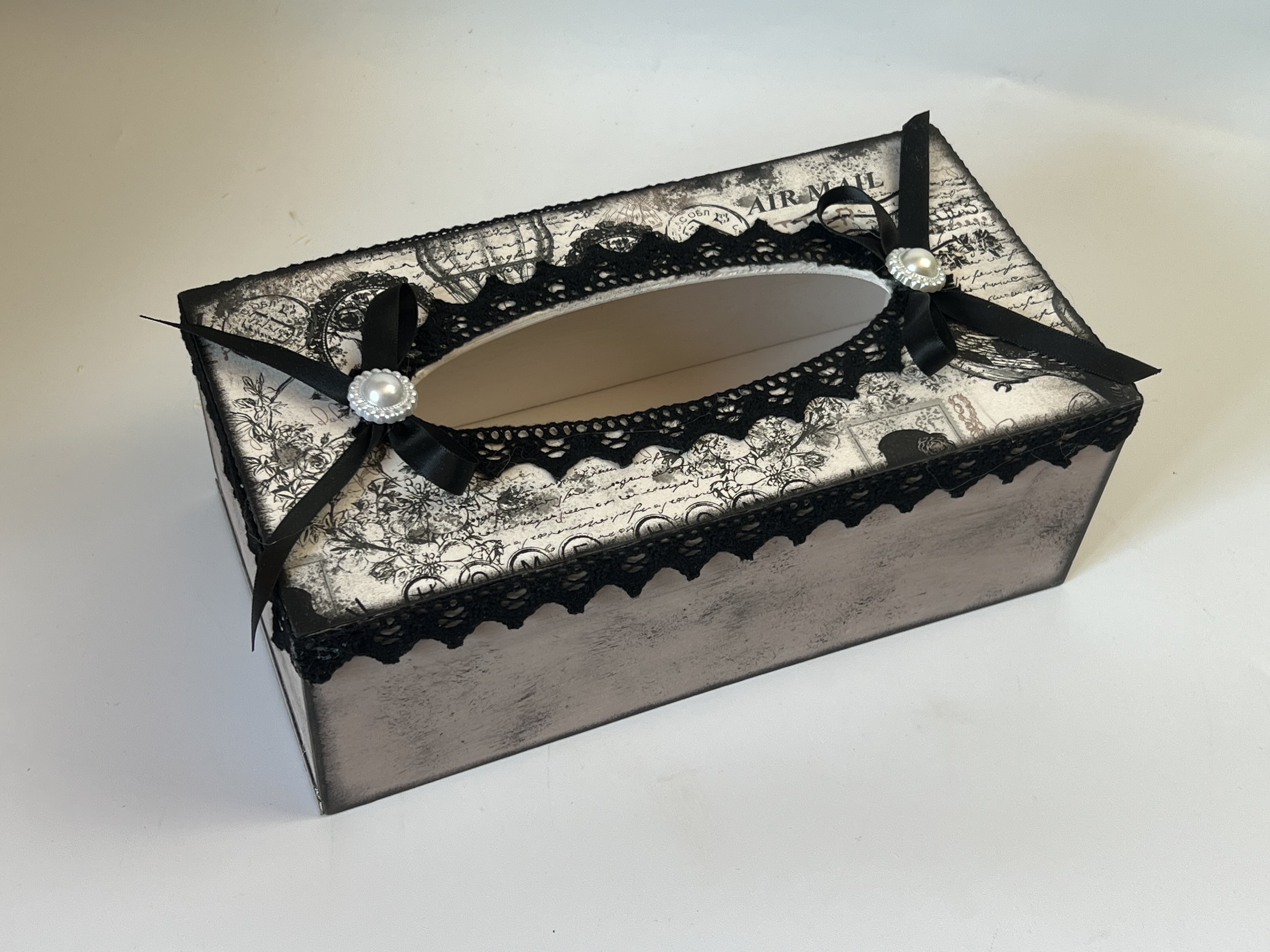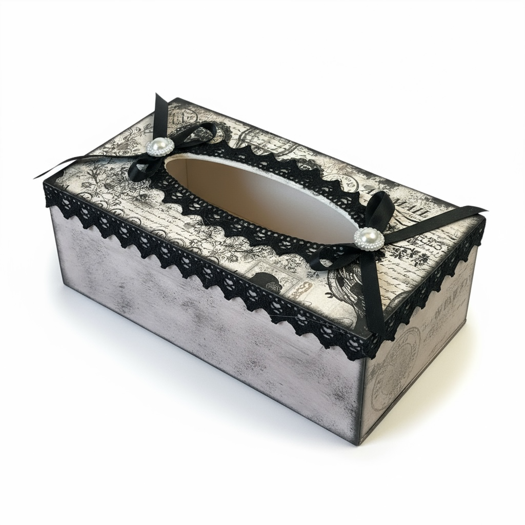 - Le pourtour et le dessus de la boîte sont ornés de dentelle noire délicate, ajoutant une touche de sophistication et de mystère.