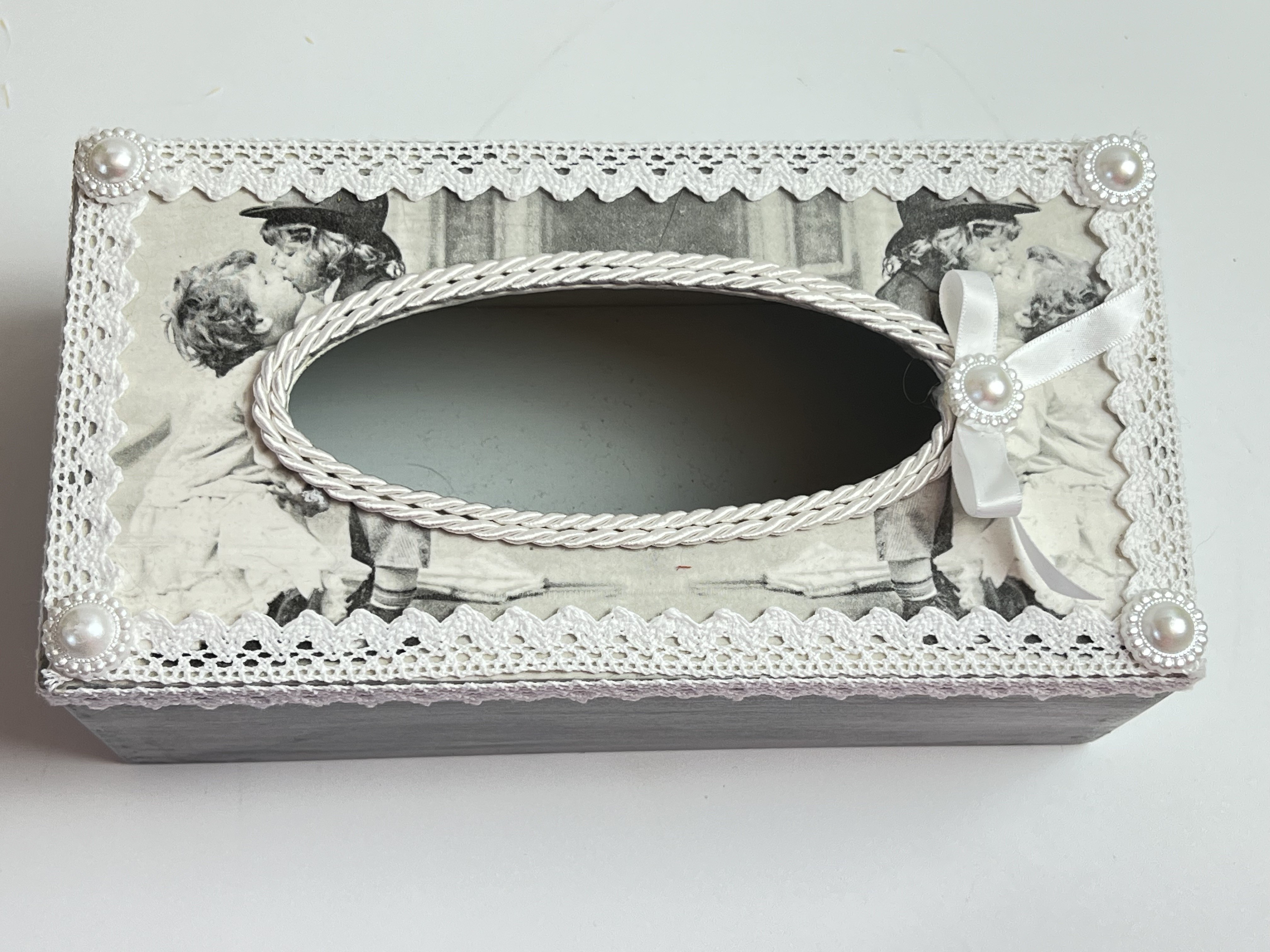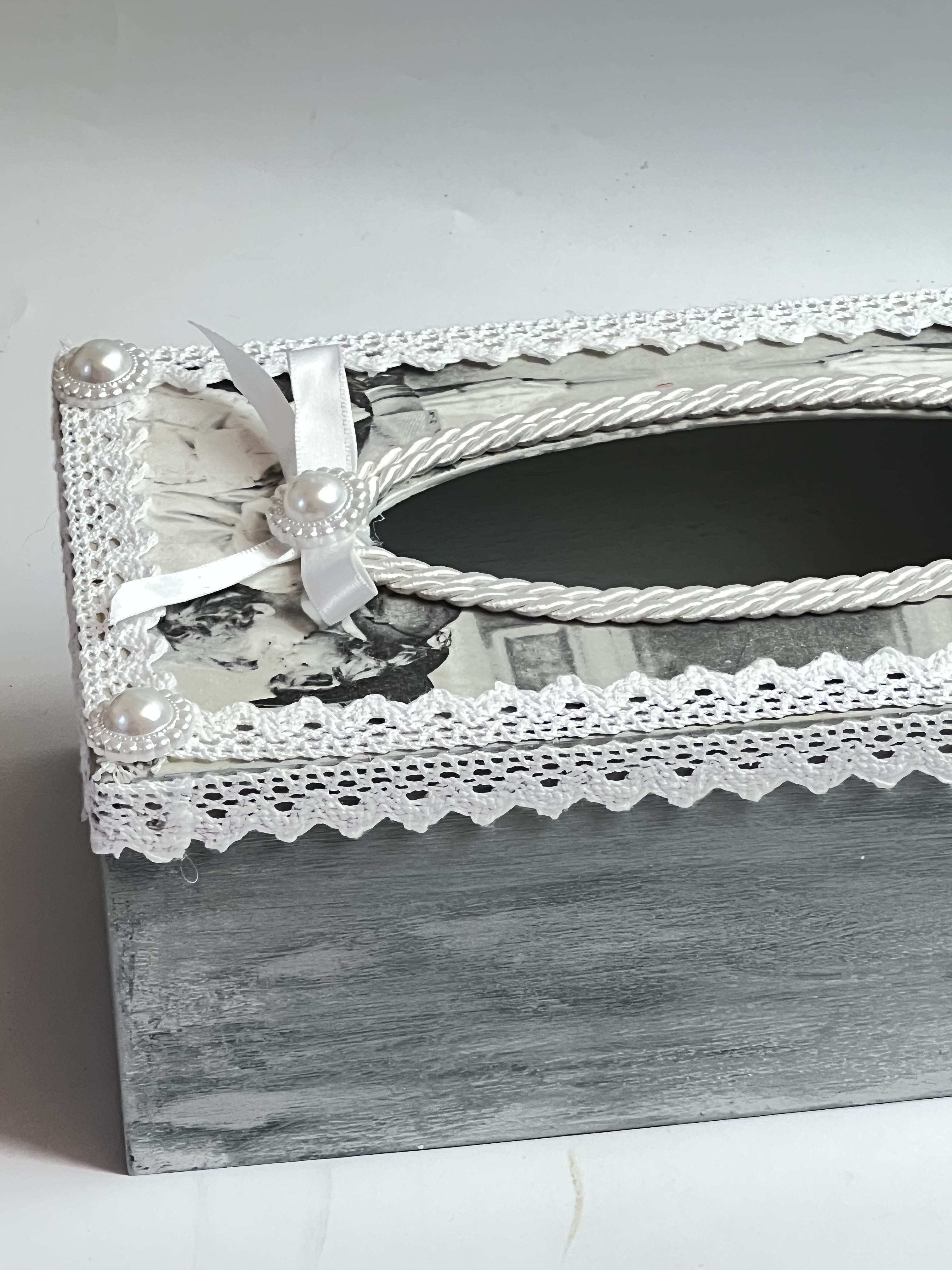 Le pourtour et le dessus de la boîte sont embellis avec de la dentelle blanche raffinée, une cordelette en satin et de délicates perles nacrées. Ces détails apportent une texture et une profondeur qui captiveront tous les regards.