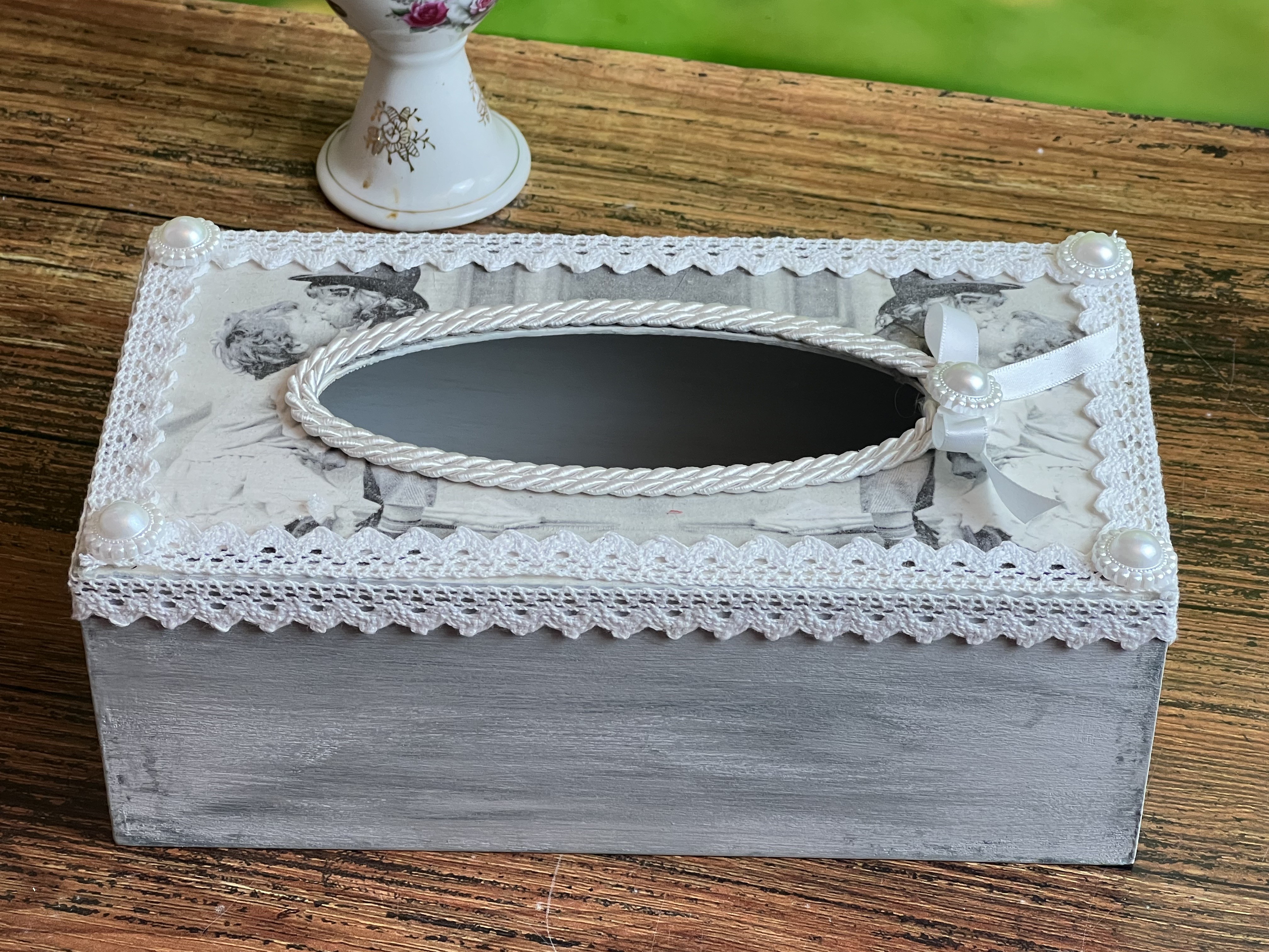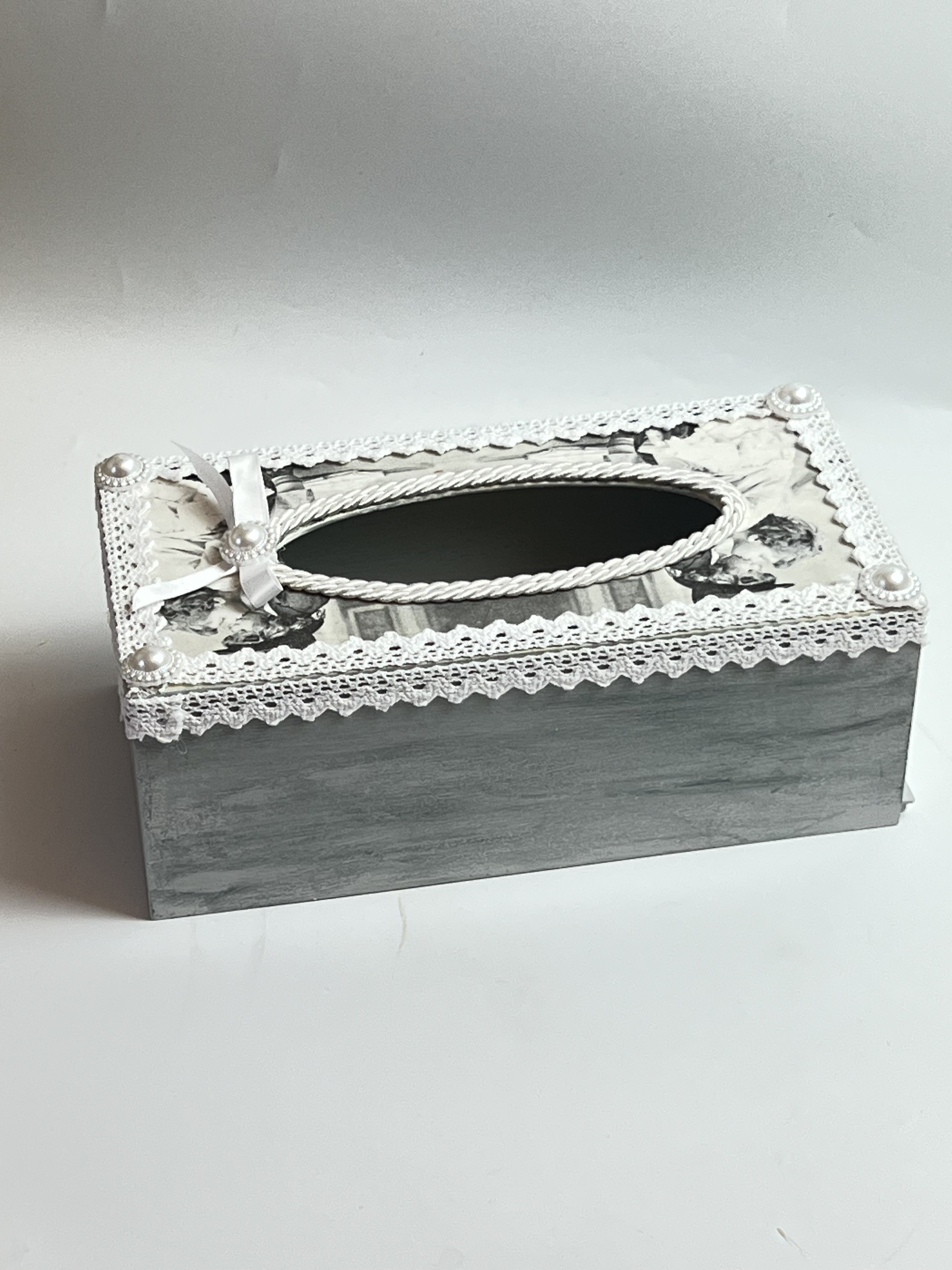 Cette boîte à mouchoirs en bois est un véritable bijou de décoration, parfaite pour ajouter une touche romantique à votre intérieur. Peinte dans une teinte grise élégante et subtilement patinée, elle respire le charme et l'authenticité.