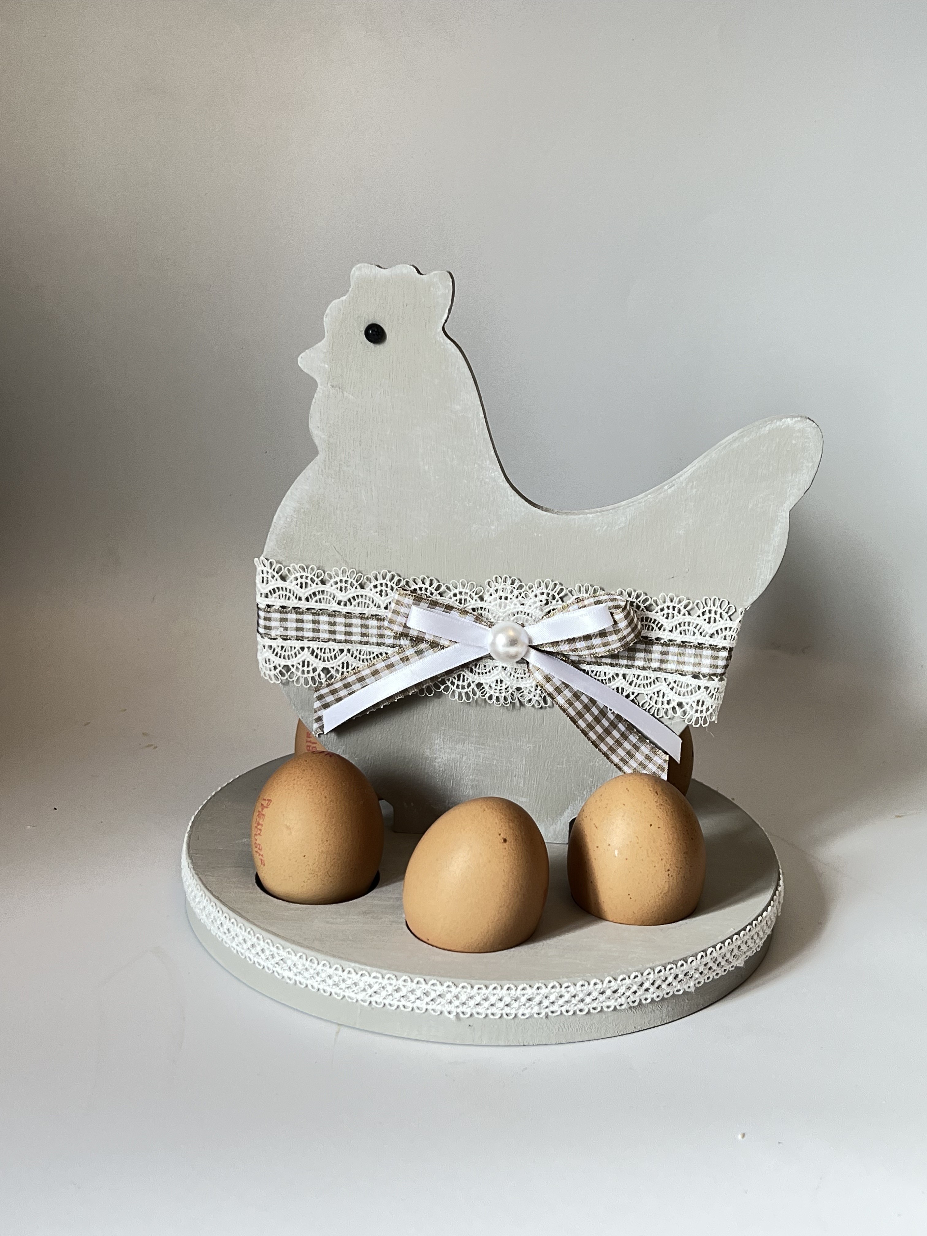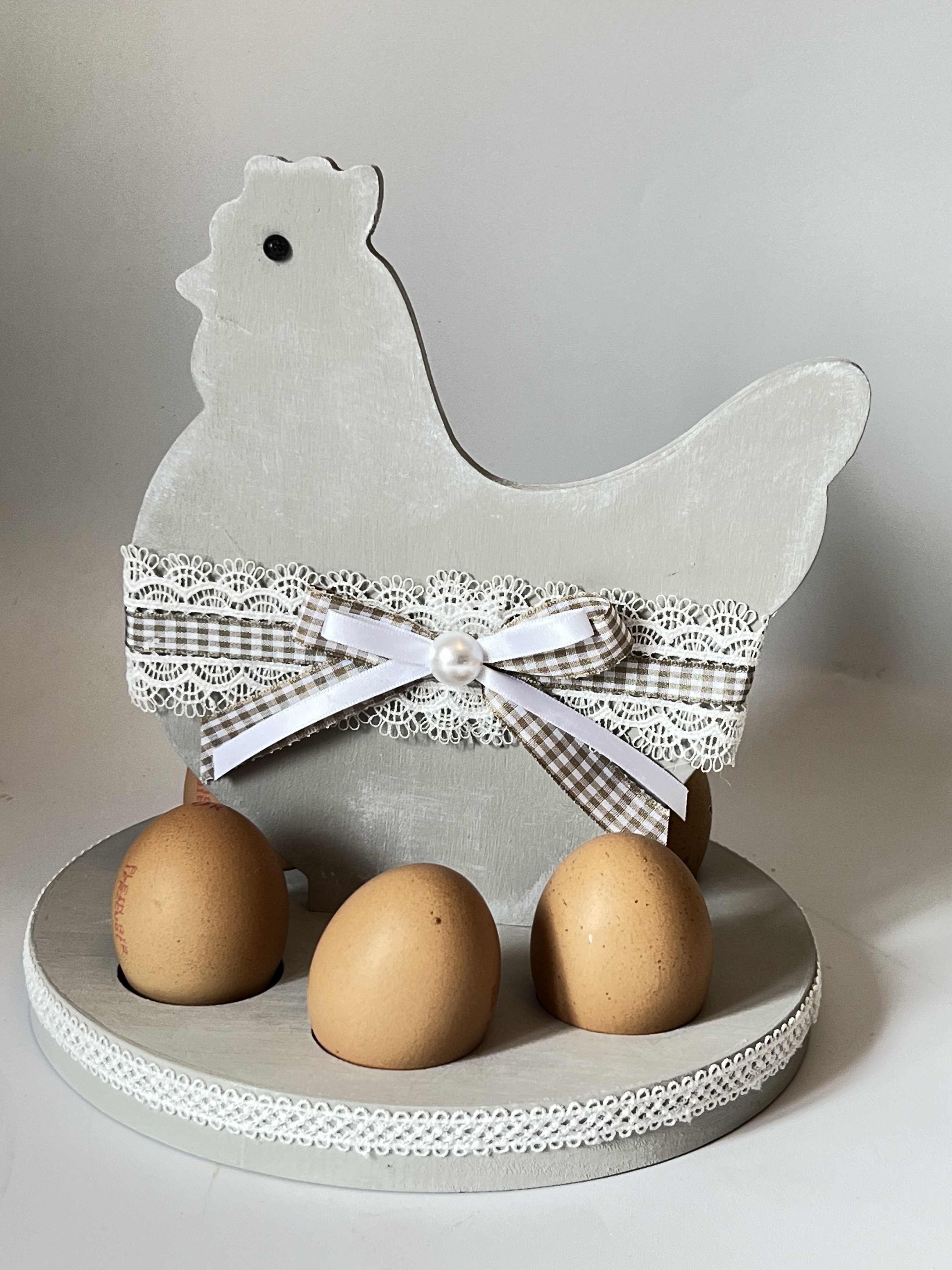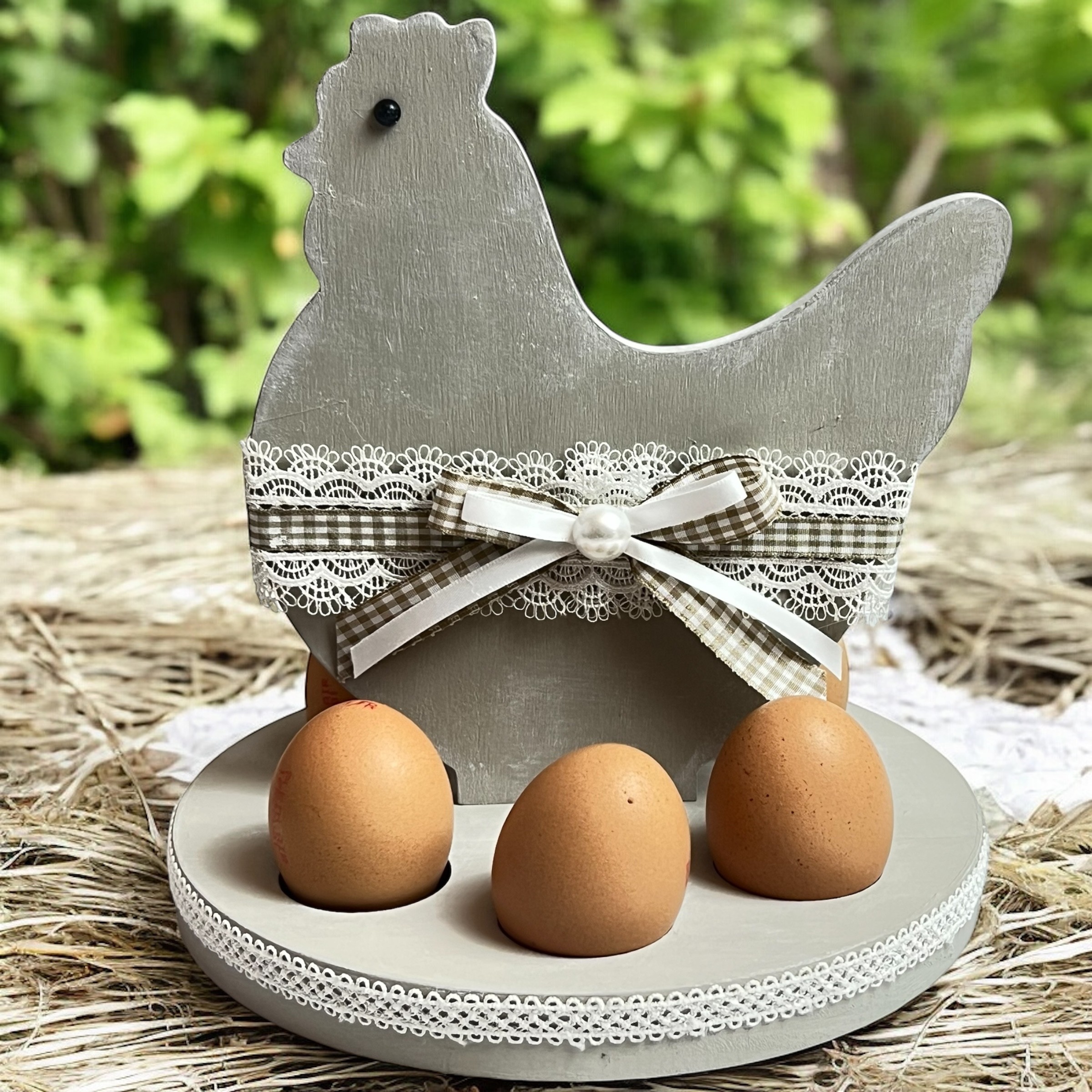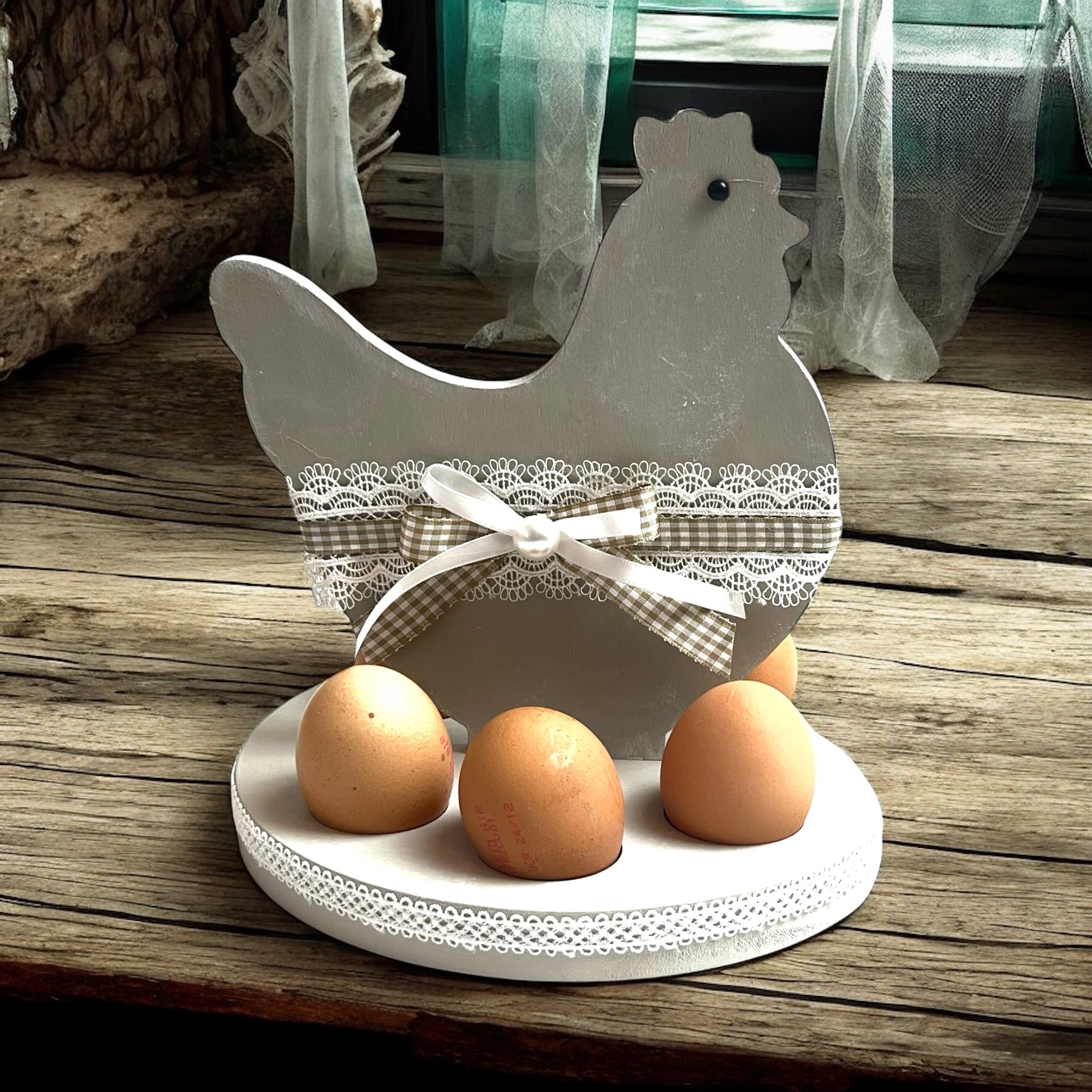 Ce porte-œufs en bois, conçu pour accueillir six œufs, est idéal pour une décoration de style shabby. Il a été peint dans une couleur grège et patiné pour lui donner un aspect ancien et authentique.