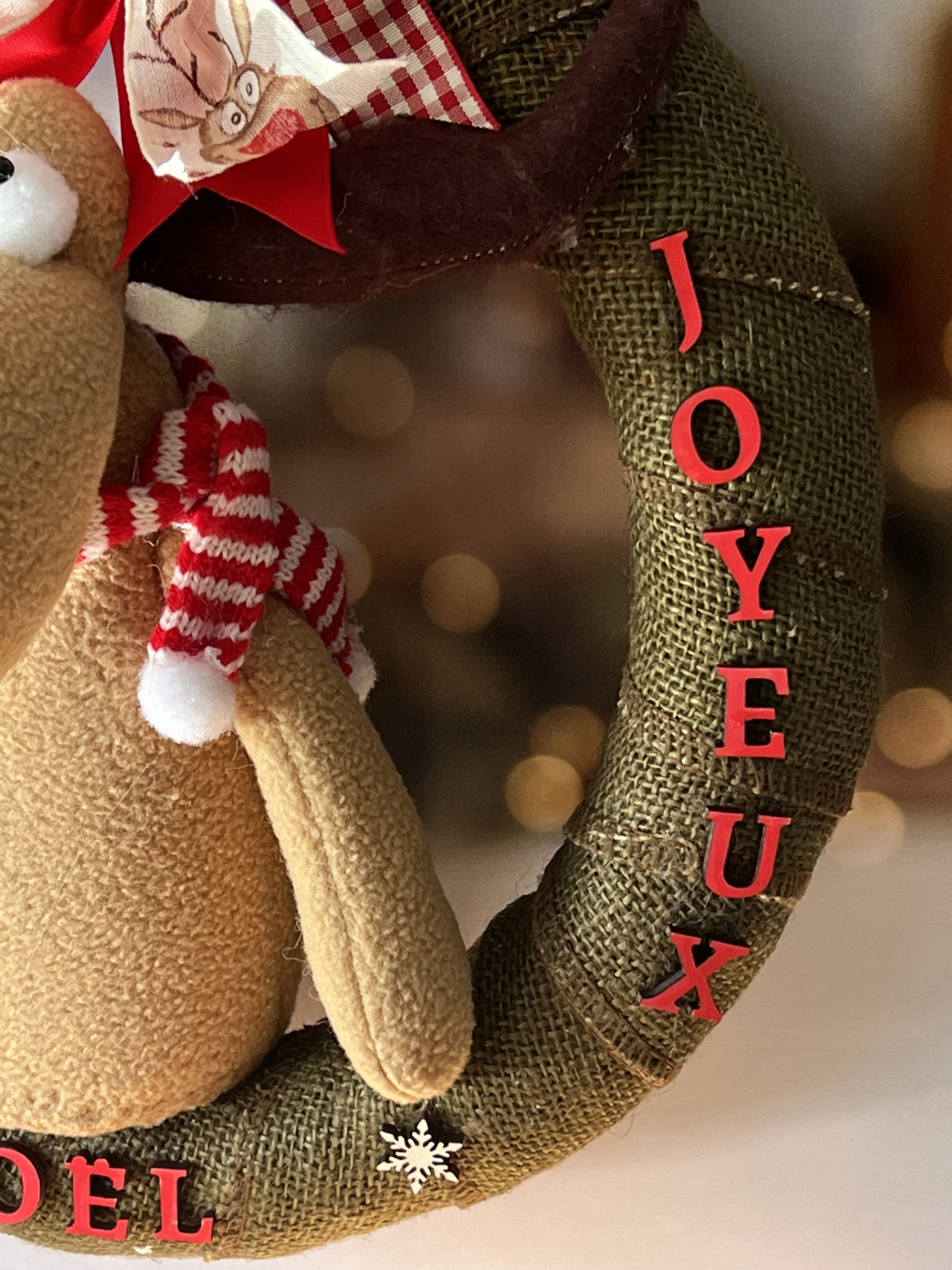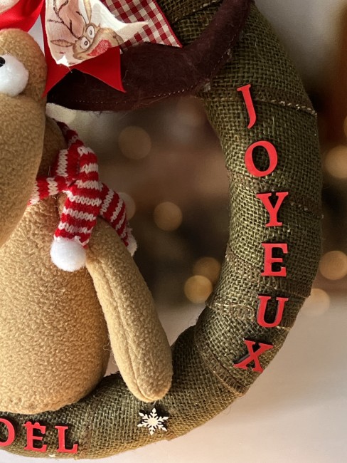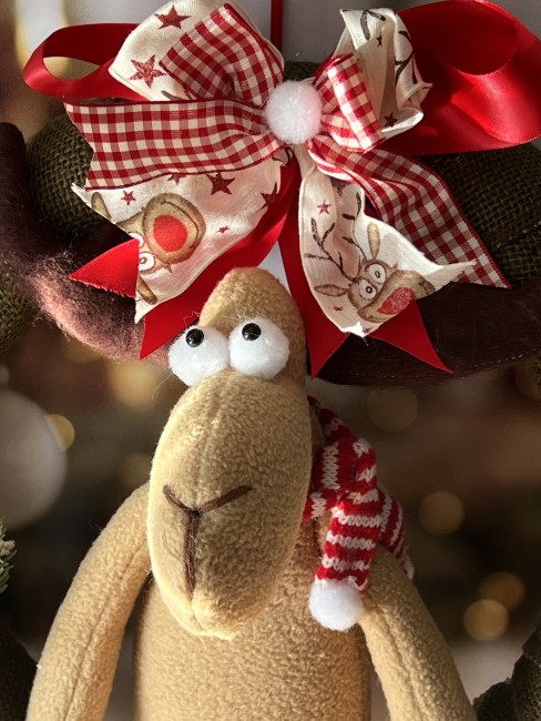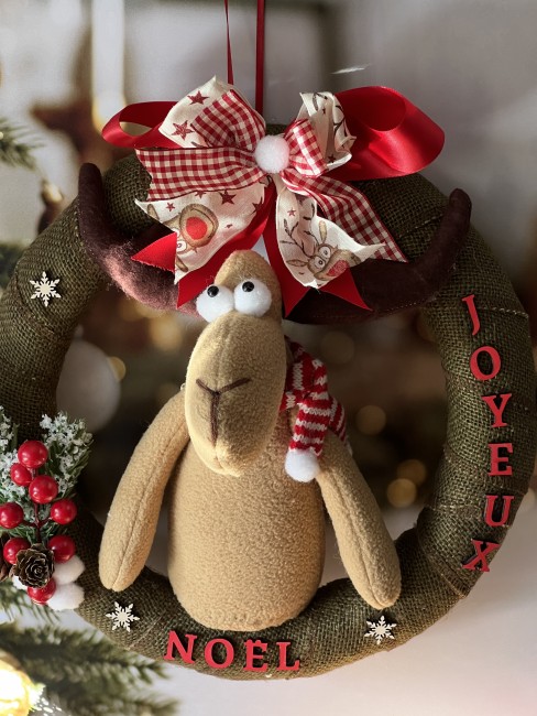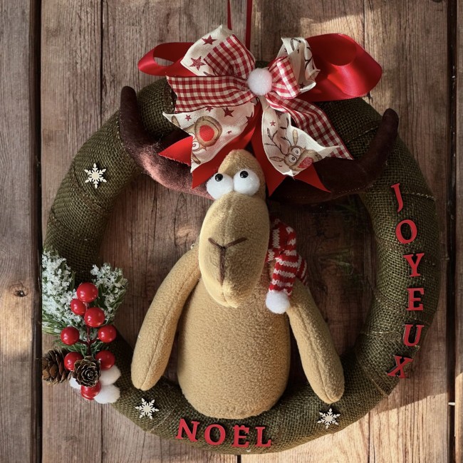 Élément Central : Un petit renne, mesurant 20 cm, entièrement fait main, est placé au centre, ajoutant une touche ludique et festive à l'ensemble.