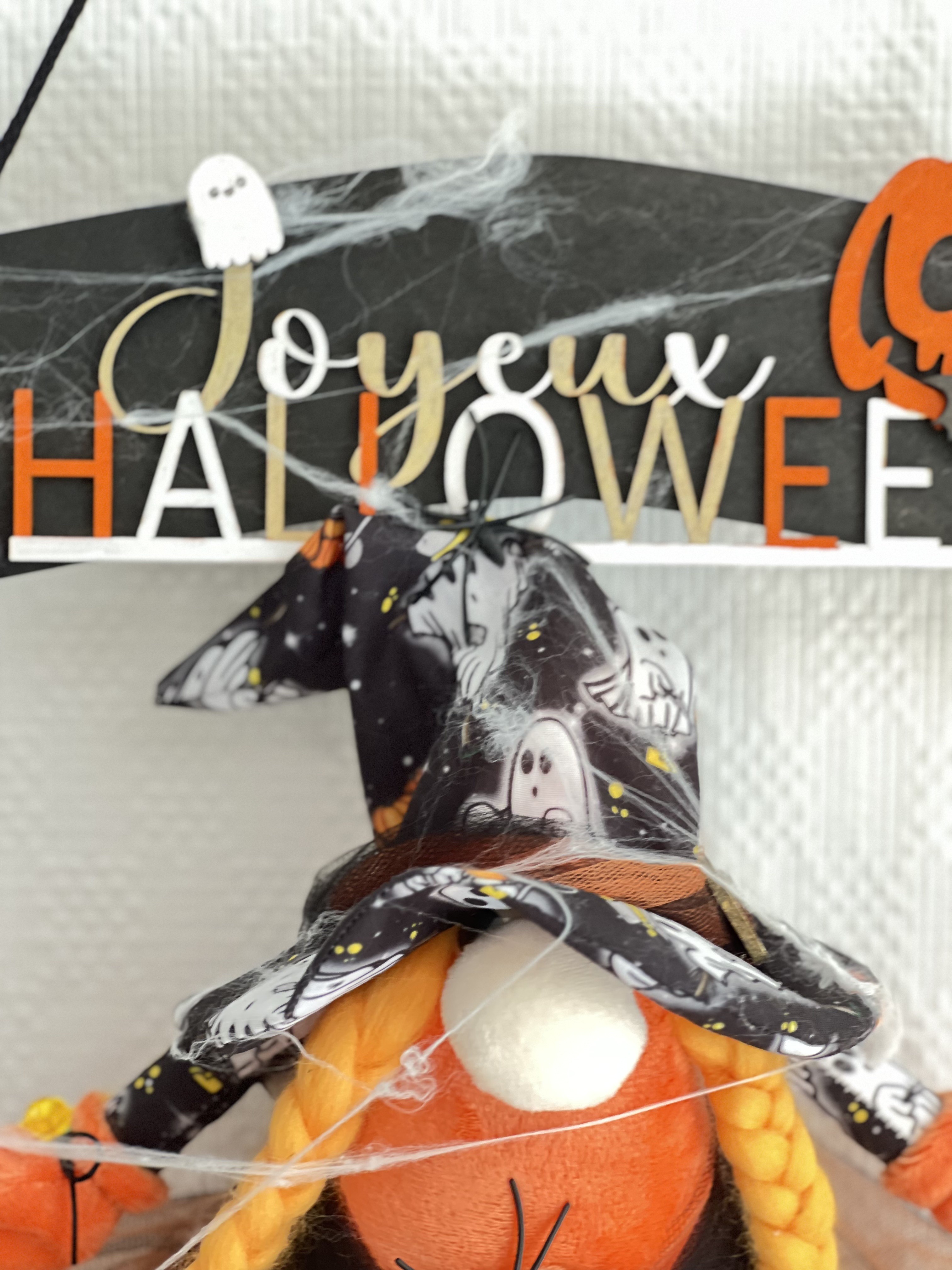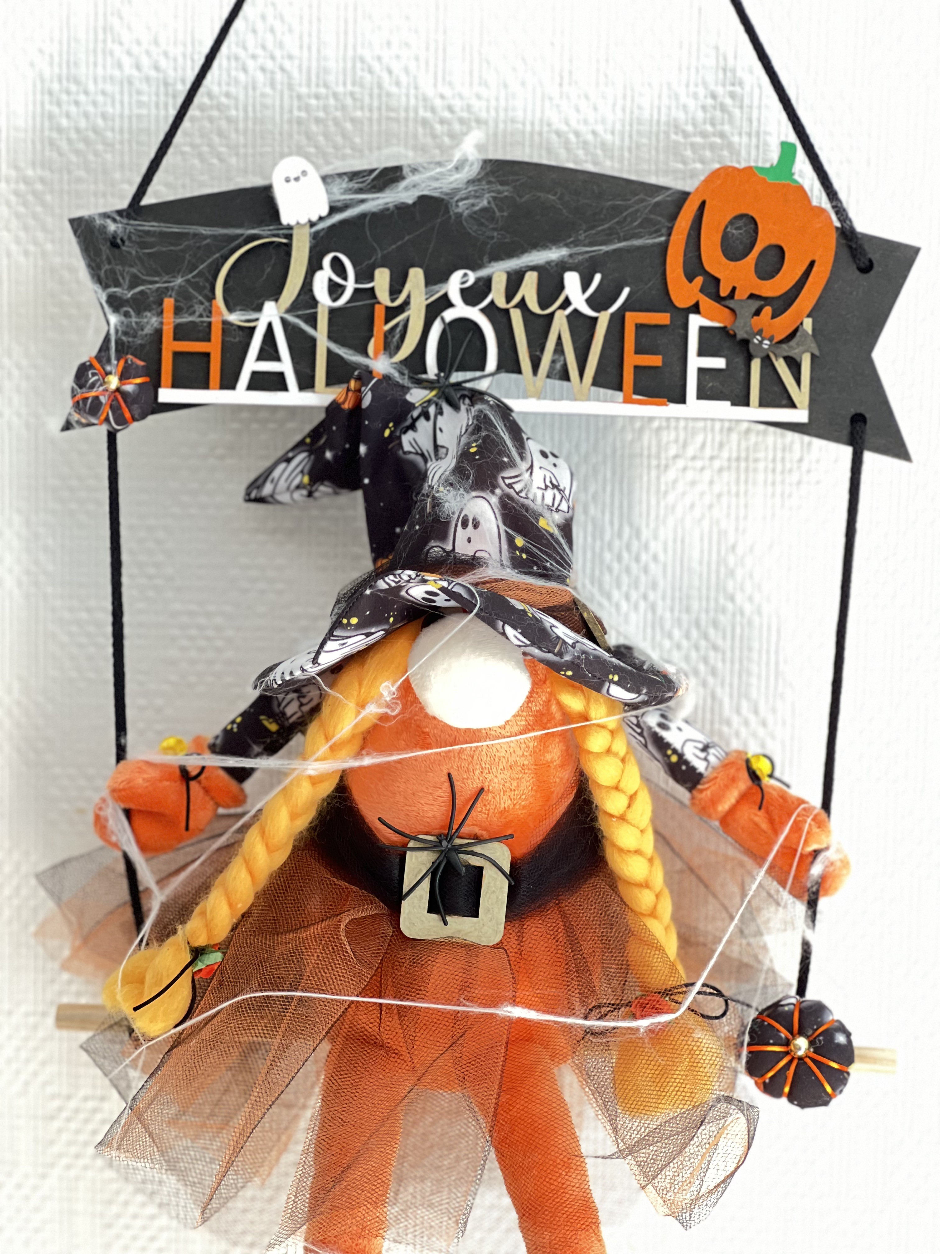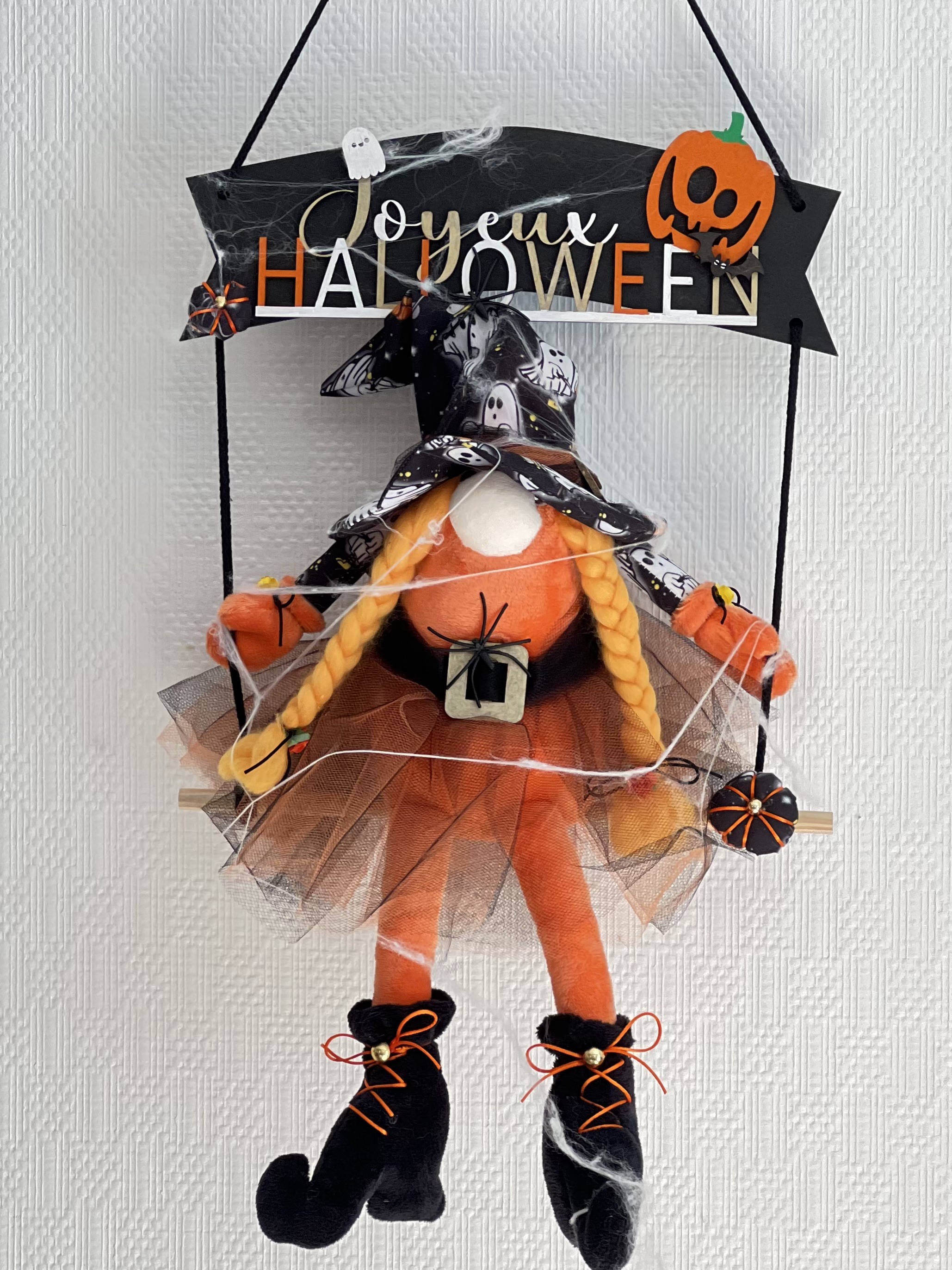Design Unique : Une sorcière espiègle, assise sur une balançoire aux couleurs vives d'orange et de noir, incarne parfaitement l'esprit d'Halloween. Elle est surmontée d'une inscription en bois spécialement conçue pour cette fête.