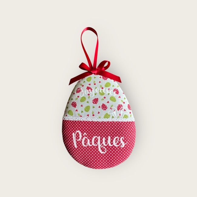 Découvrez notre magnifique œuf de Pâques en bois, soigneusement recouvert d'un tissu imprimé aux motifs de Pâques dans des tons verts et framboises écrasées. Cet objet décoratif est parfait pour apporter une touche festive et colorée à votre intérieur pendant les célébrations pascales.