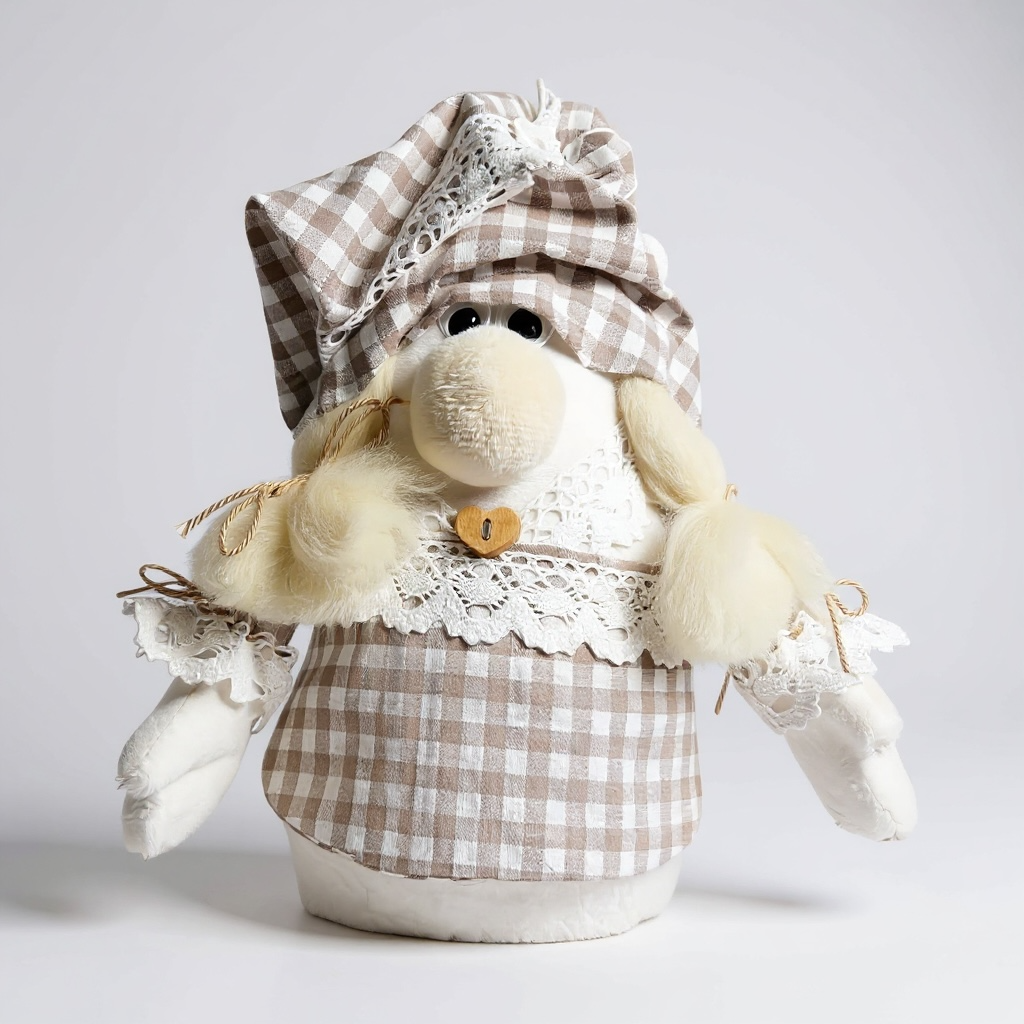 Matériaux : Confectionné avec de la fausse fourrure, du tissu en coton, et doté de deux yeux espiègles. Le modèle « madame » se distingue par un petit tablier assorti au bonnet, orné d'une décoration délicate.