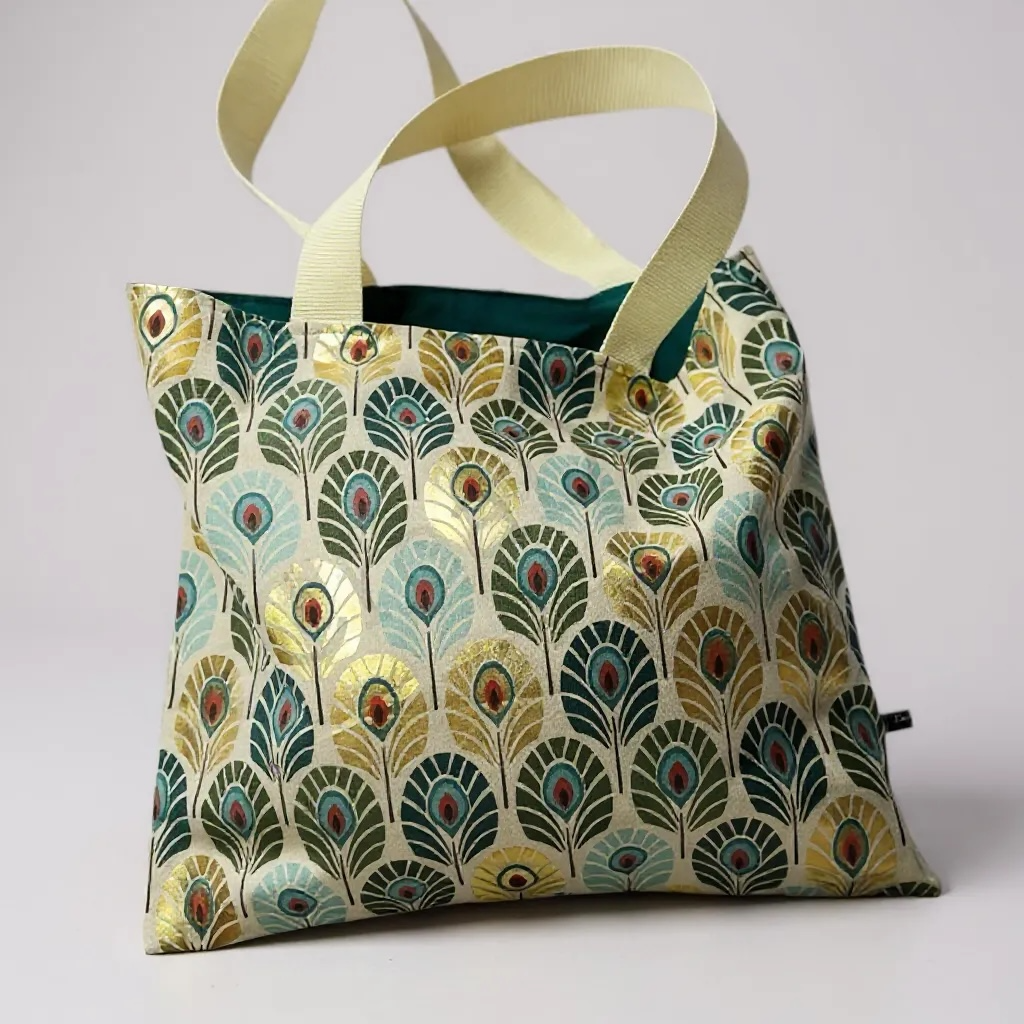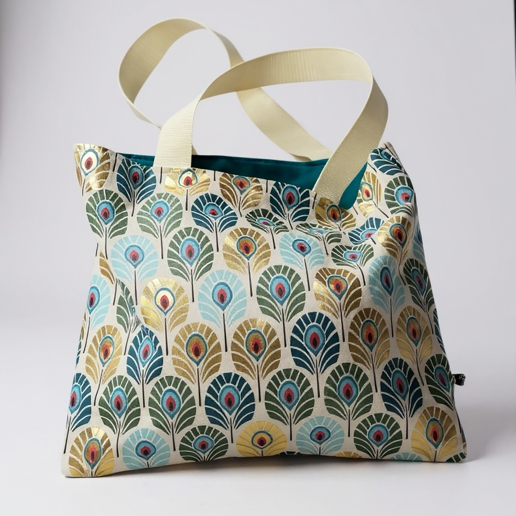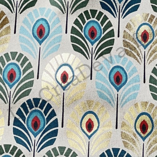 - Extérieur : toile aspect lin aux superbes motifs plumes de paon bleu canard et doré foil, pour un style chic et raffiné.