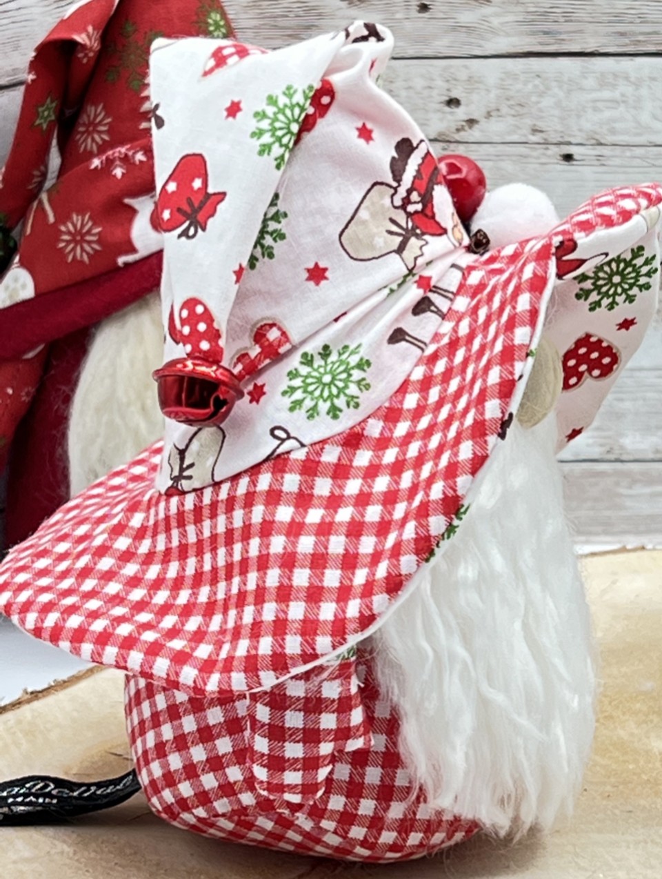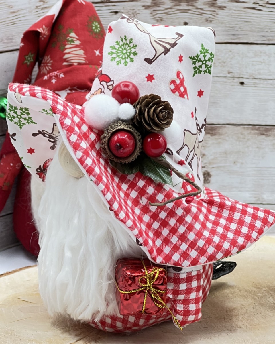 •Détails festifs : grelot rouge et petite décoration sur le chapeau. Tient un petit cadeau rouge dans sa main.