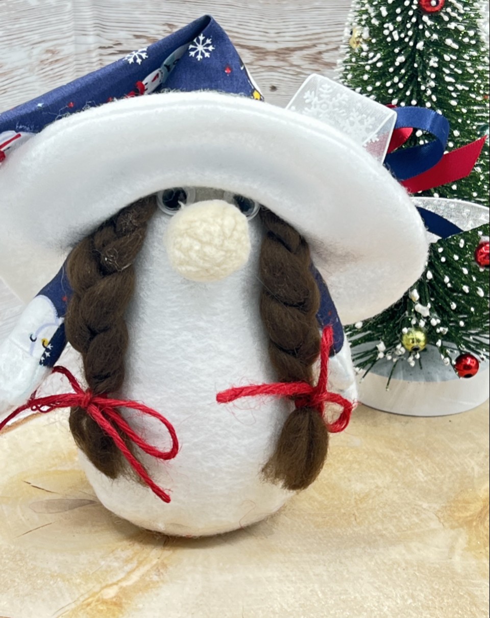 • Matériaux : feutrine, tissu imprimé de Noël, laine à feutrer, yeux expressifs et deux jolies tresses brunes.
