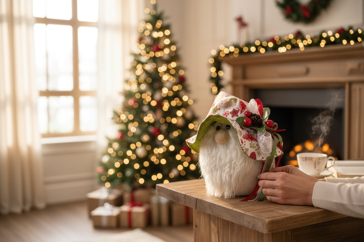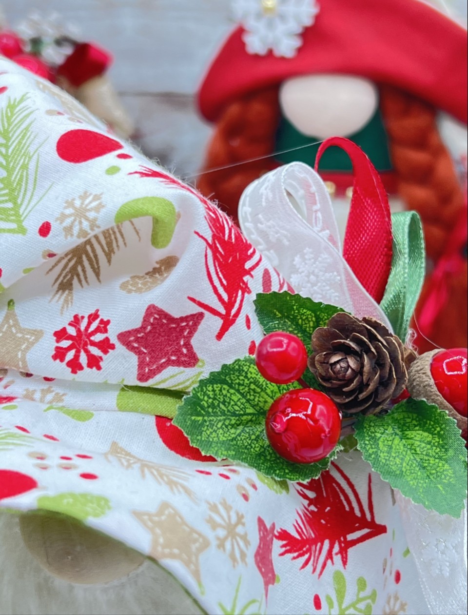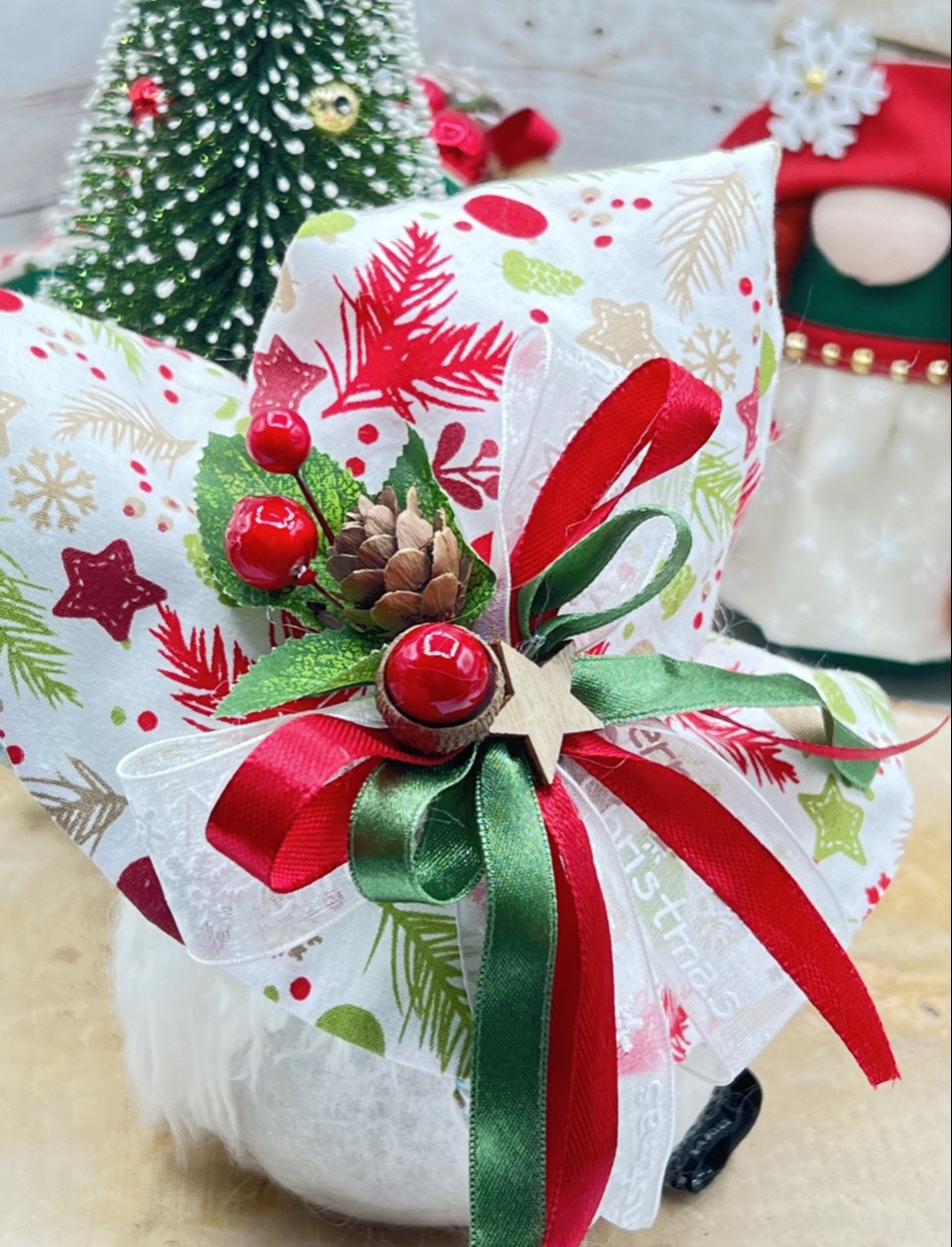 Voici un petit gnome de Noël décoratif, réalisé entièrement à la main, qui apportera immédiatement une ambiance chaleureuse et festive à votre intérieur. Sa tenue soignée aux tons blanc et vert, agrémentée d’un grelot et d’une décoration sur son chapeau, en fait une pièce unique qui illuminera vos fêtes.