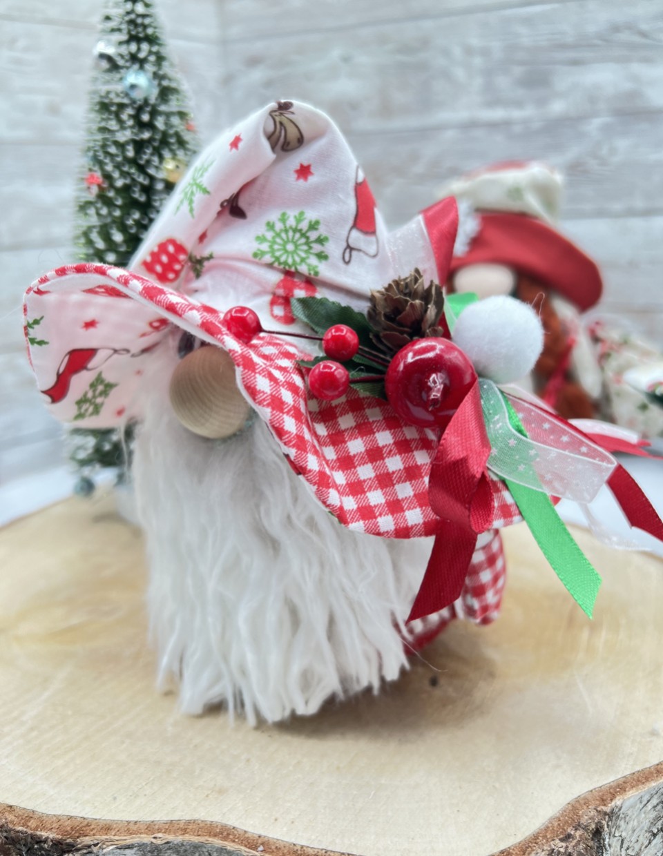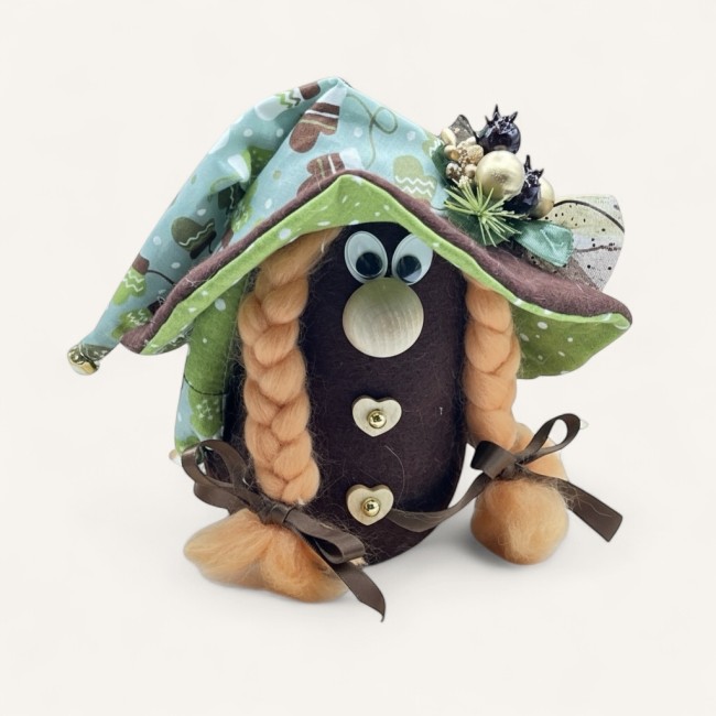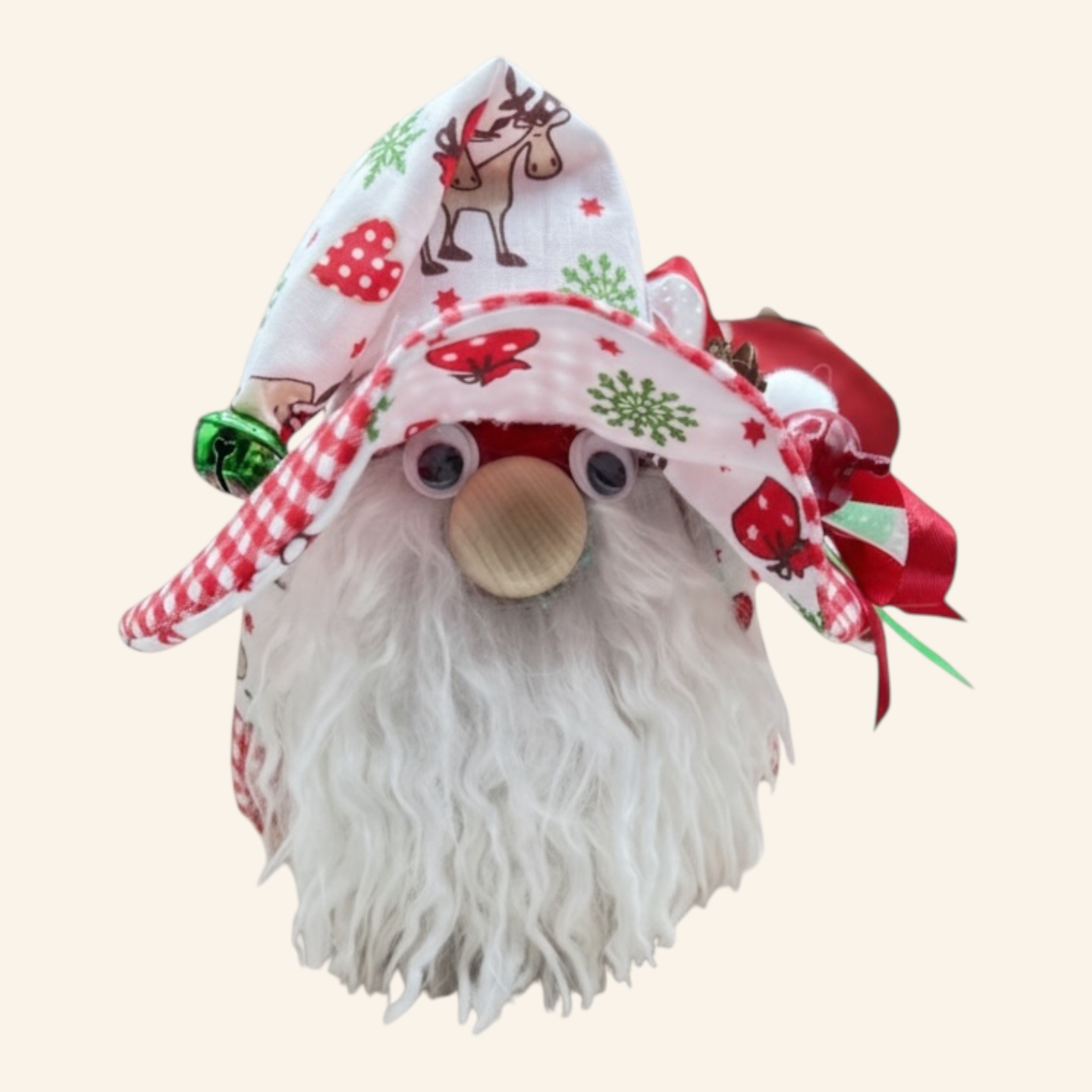 Voici un petit gnome de Noël décoratif, réalisé entièrement à la main, qui apportera immédiatement une ambiance chaleureuse et festive à votre intérieur. Sa tenue soignée aux tons rouge et vert, agrémentée d’un grelot et d’une décoration sur son chapeau, en fait une pièce unique qui illuminera vos fêtes.