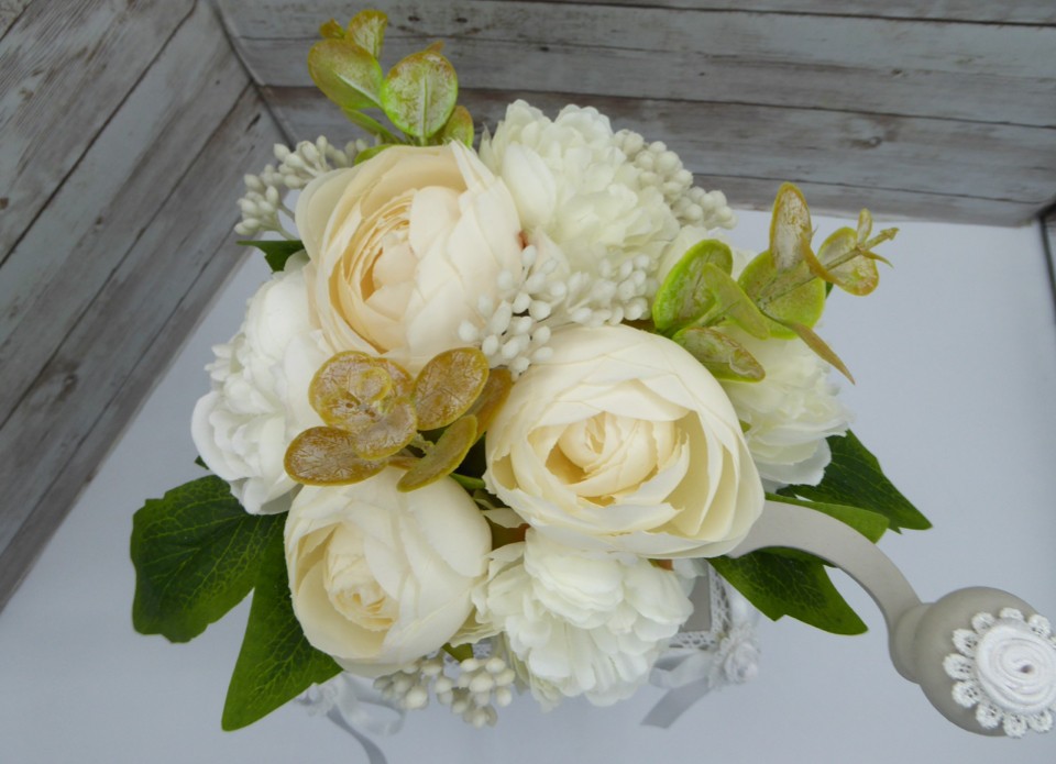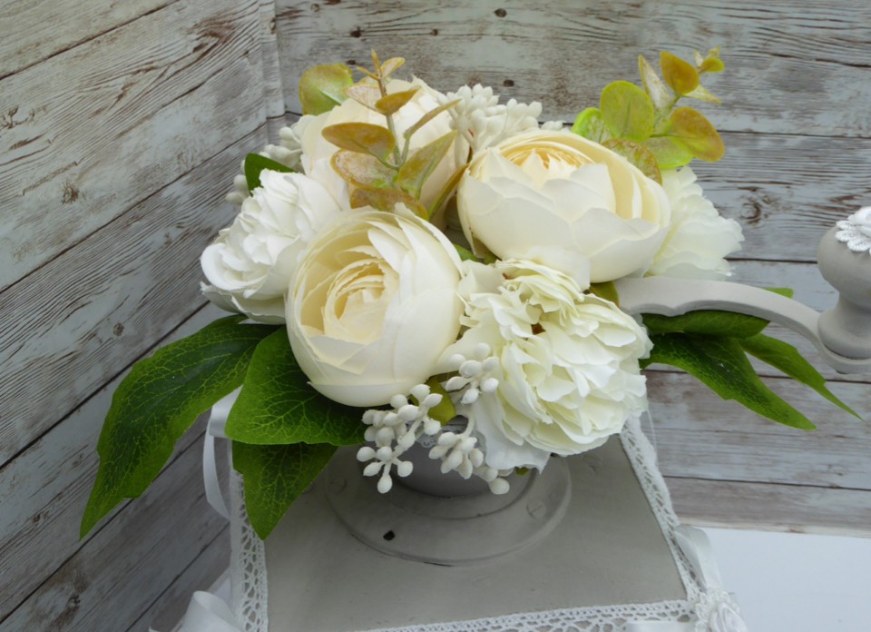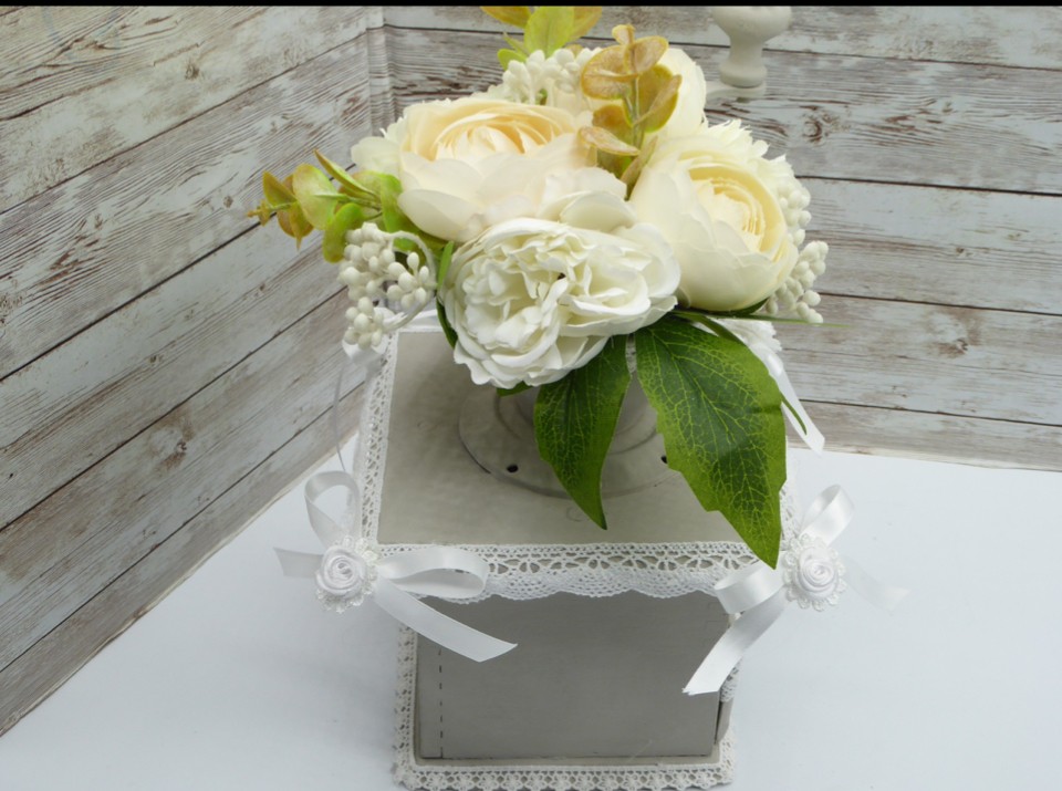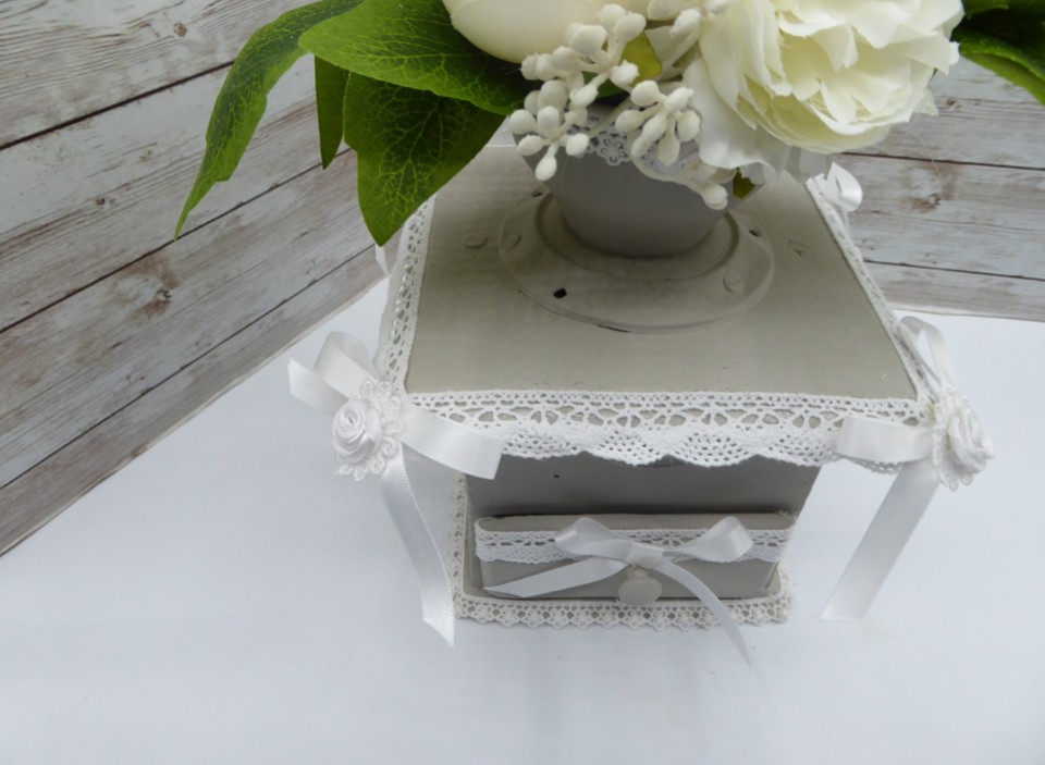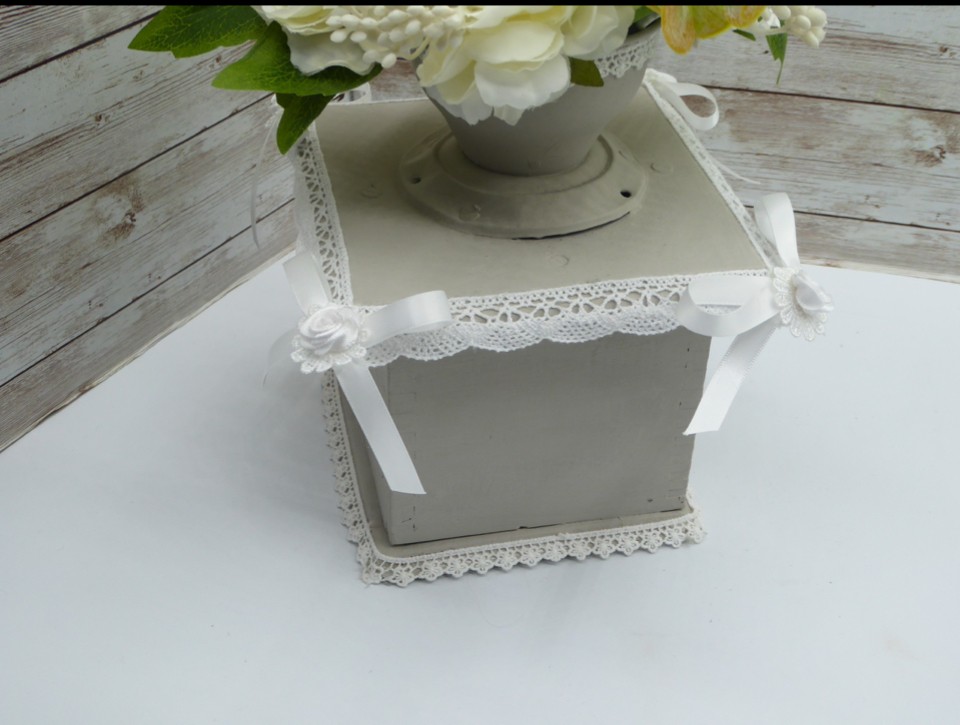 •🌸 Décoré de dentelle blanche, rubans de satin et fleurs en soie au centre