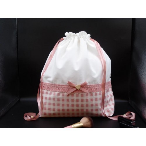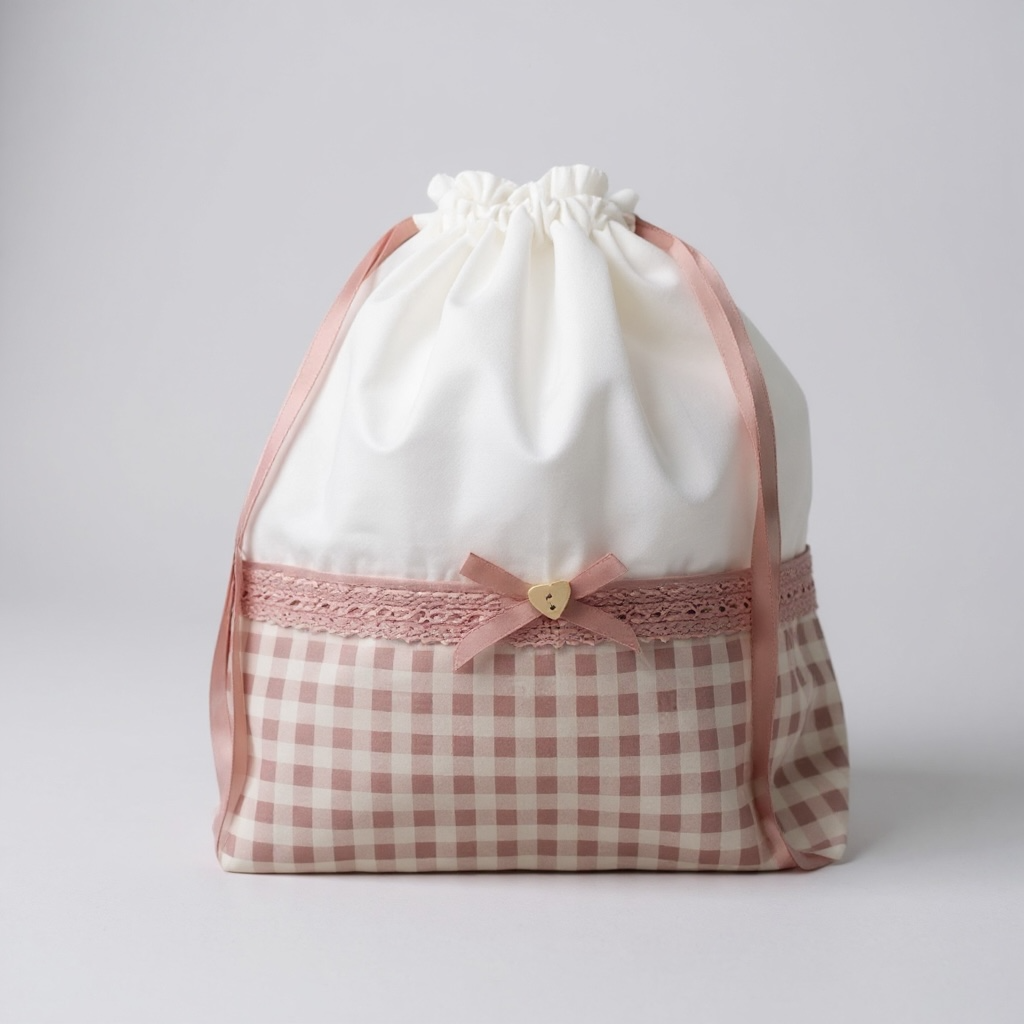 Ce sac pochon XL5 est un accessoire pratique et élégant, entièrement fait main. Réalisé à partir de deux tissus 100 % coton, il combine un imprimé à carreaux rose et blanc avec un coton uni blanc.