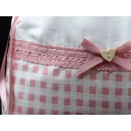 Une dentelle rose délicate, deux nœuds en satin et deux cœurs en bois décoratifs viennent parfaire ce modèle unique.