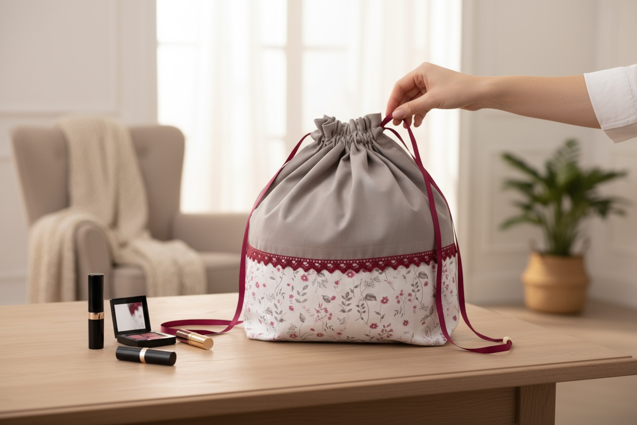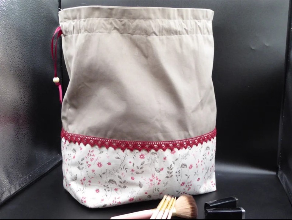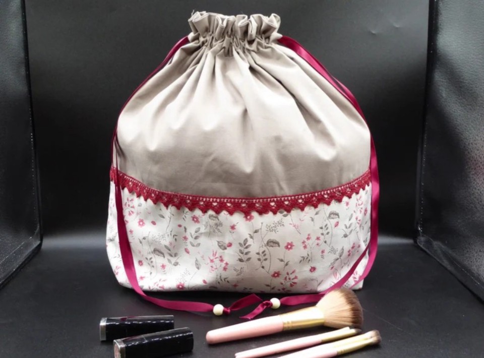 Ce sac pochon de rangement XL3 est entièrement doublé et fabriqué à la main. Il se compose d’un tissu floral raffiné et d’un tissu uni taupe pour une touche élégante. Fermeture à liens coulissants et finitions en dentelle rouge bordeaux avec liens en satin.