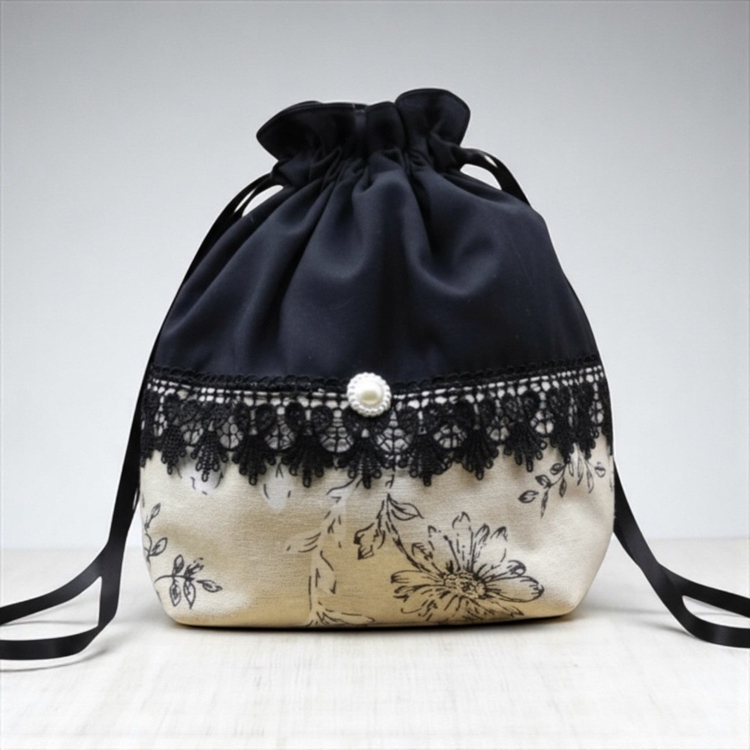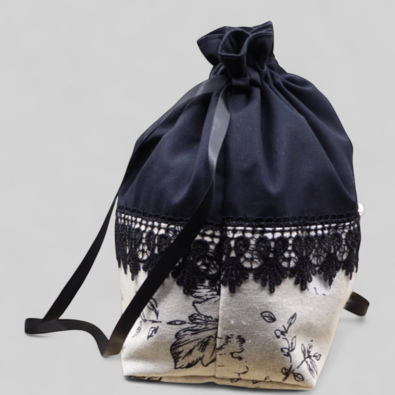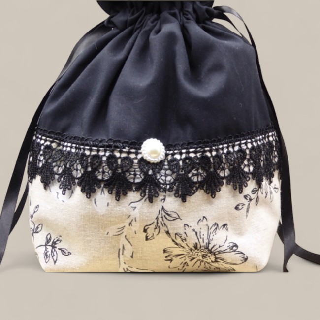 Ce sac pochon dentelle noire et lin incarne l’élégance et la délicatesse du fait main. Réalisé avec soin dans notre atelier, il associe deux tissus nobles : un coton noir profond et un lin imprimé floral, pour un contraste raffiné.