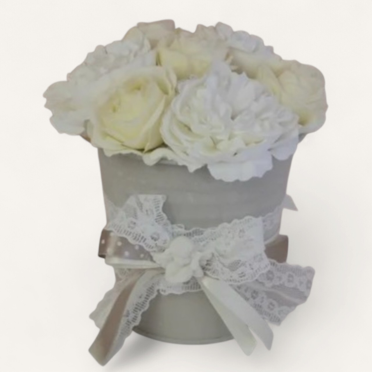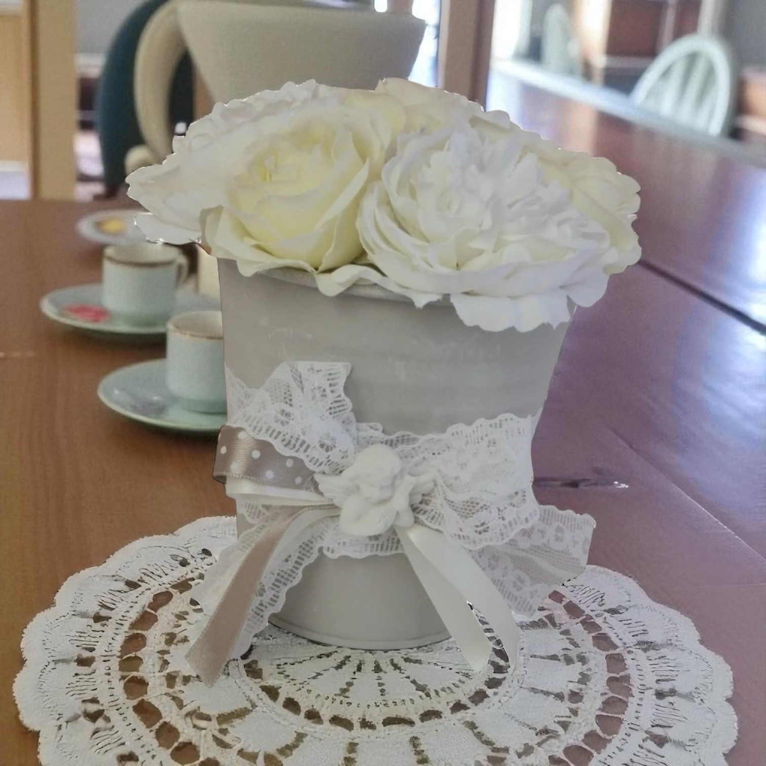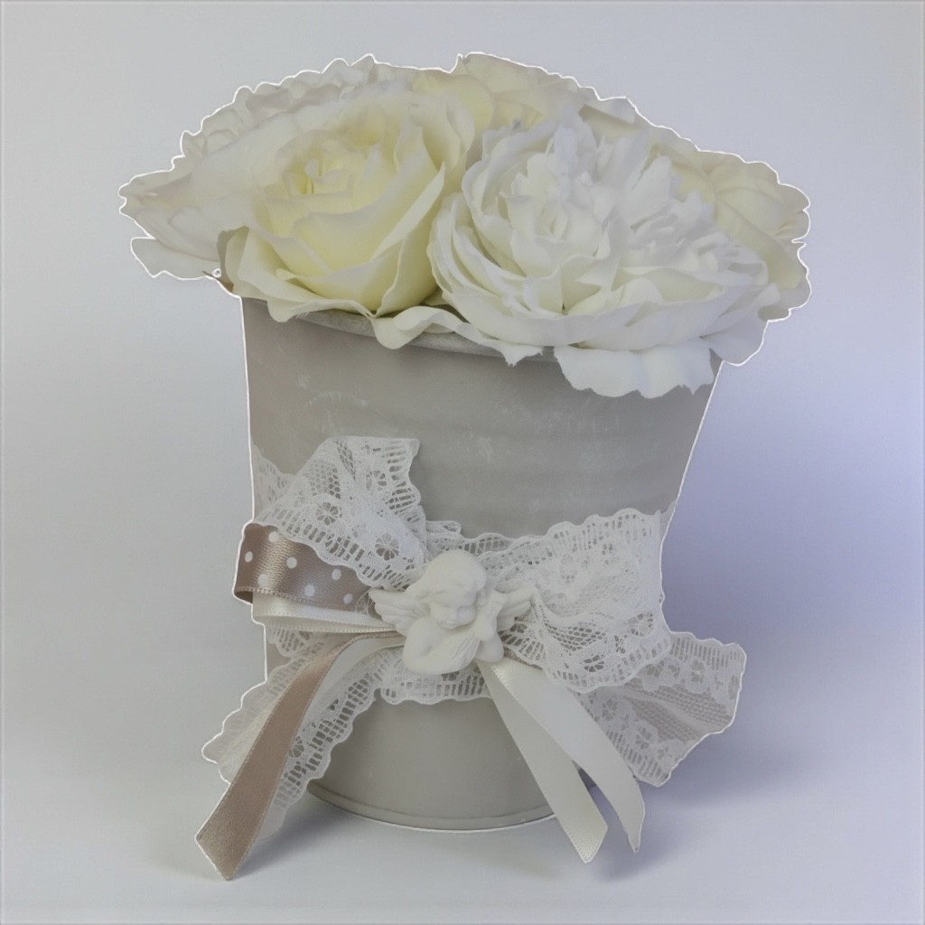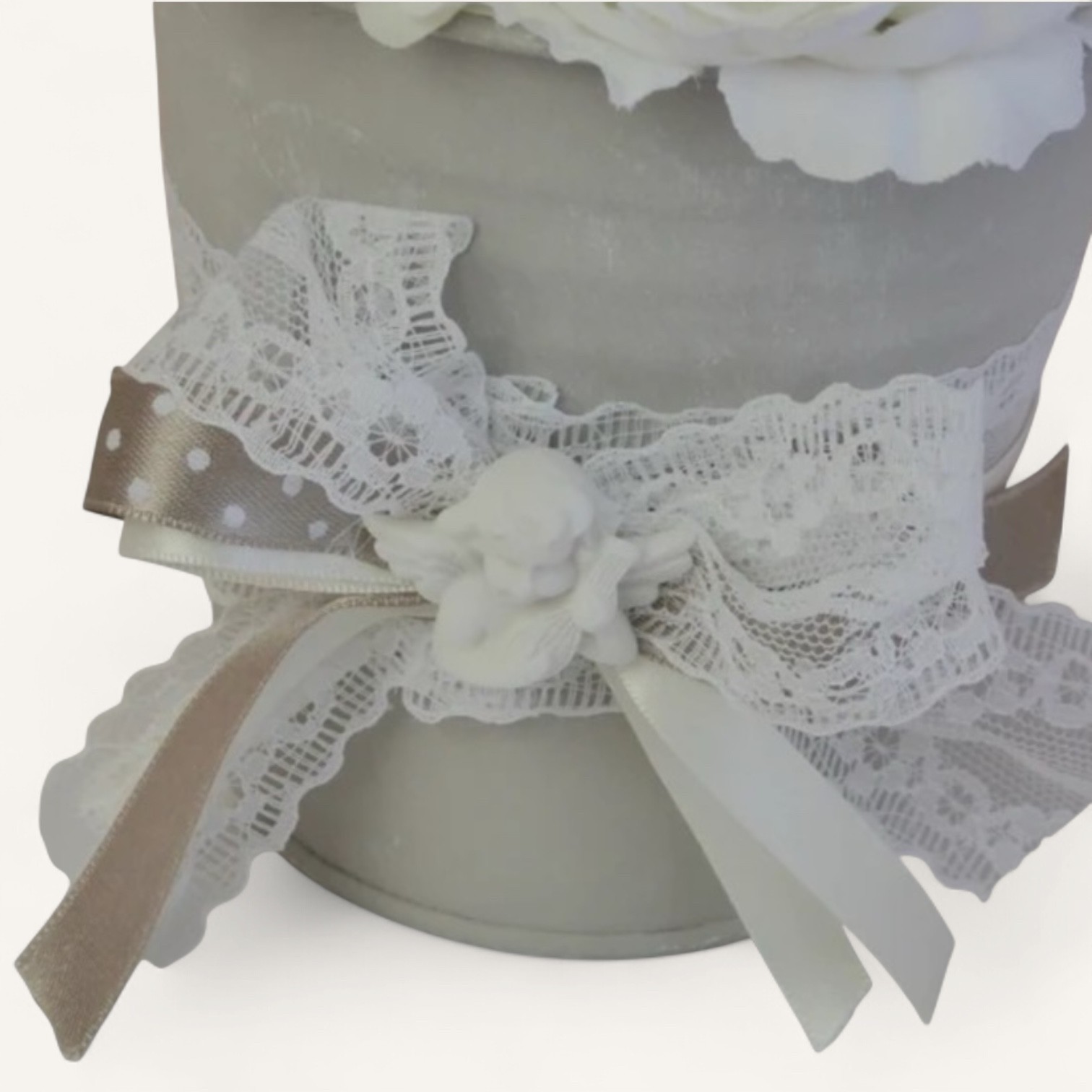 Cette décoration florale a été soigneusement confectionnée à la main dans un pot en zinc taupe patiné. Elle est ornée de fleurs artificielles blanches en soie, de rubans en satin, de dentelle délicate et de deux anges en résine. Chaque détail a été pensé pour apporter une touche de charme et de douceur à votre intérieur.