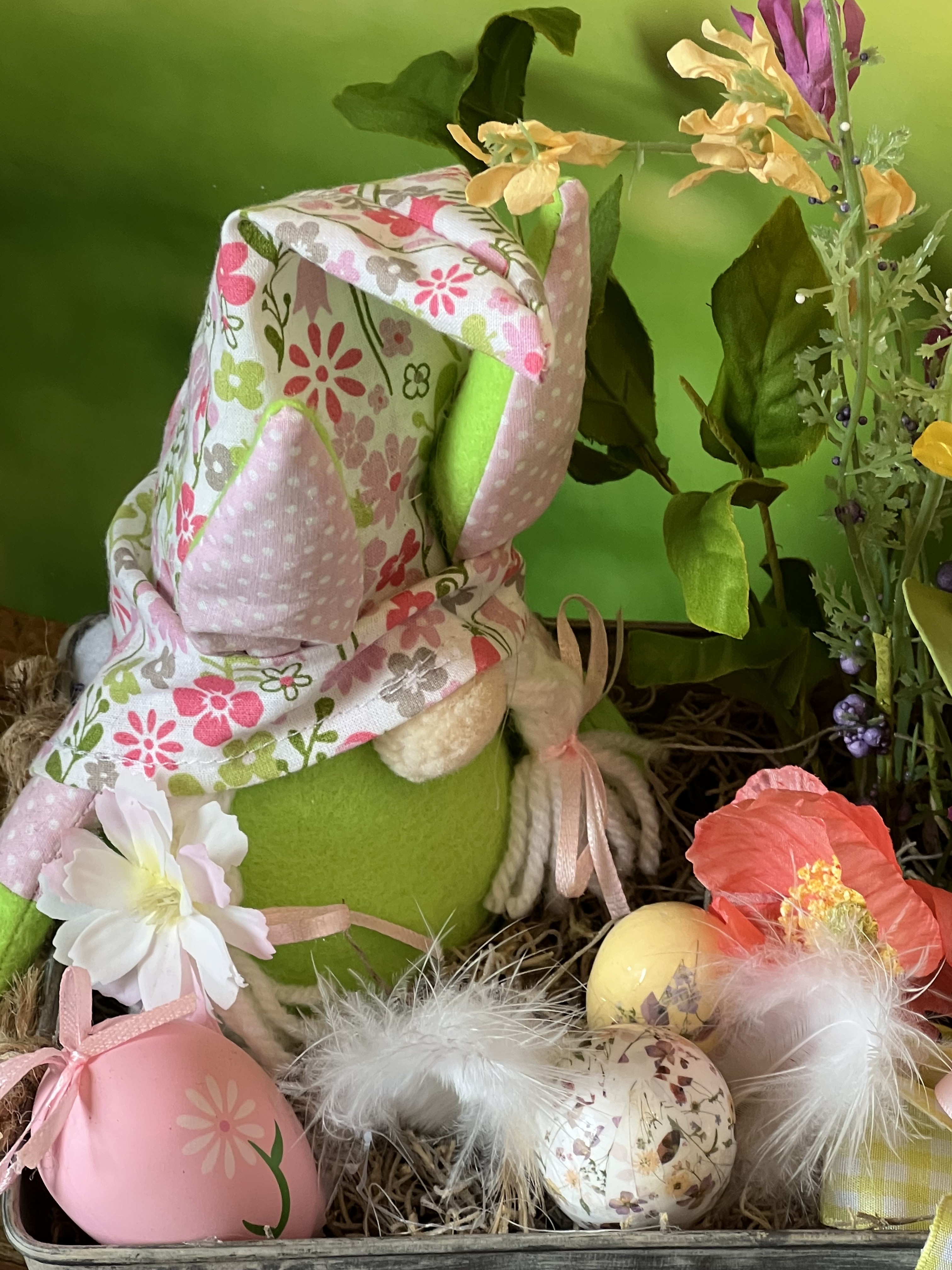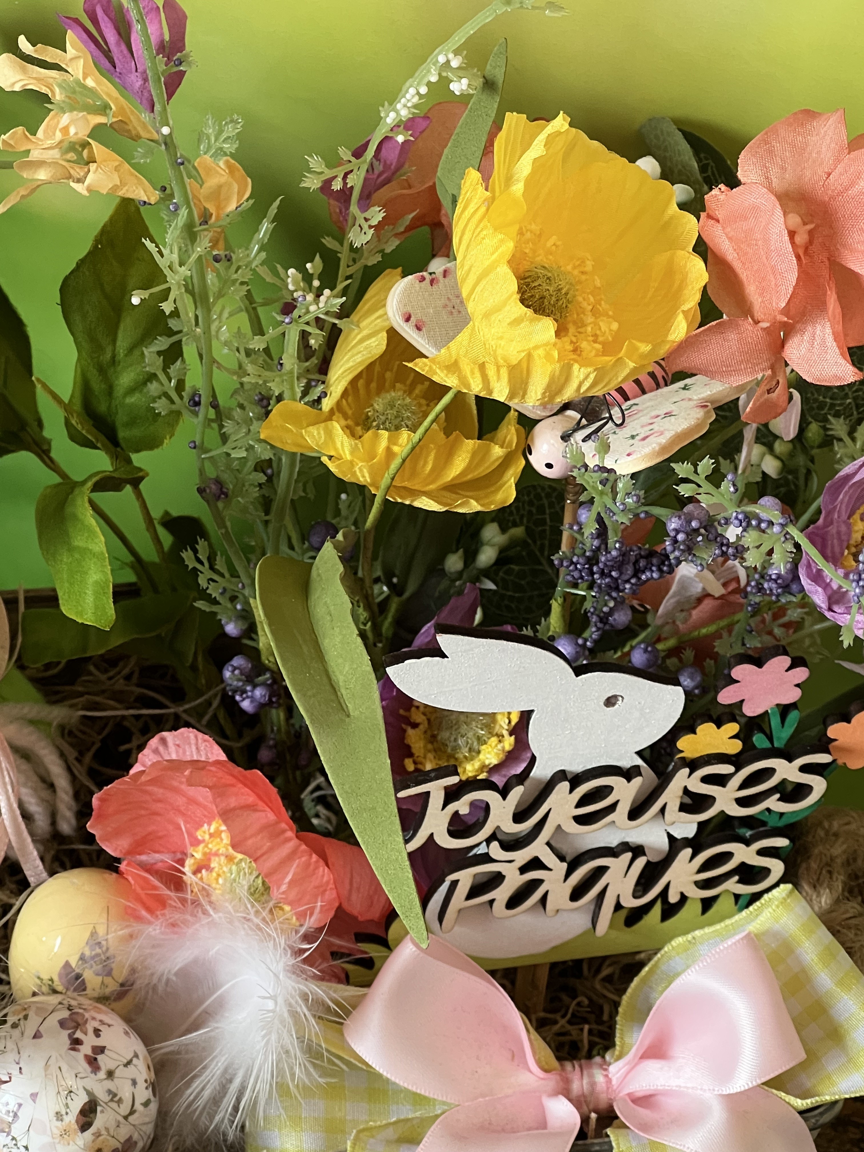 Je vous propose cette décoration unique pour Pâques idéale pour embellir votre intérieur avec une ambiance chaleureuse et colorée. Elle est composée :