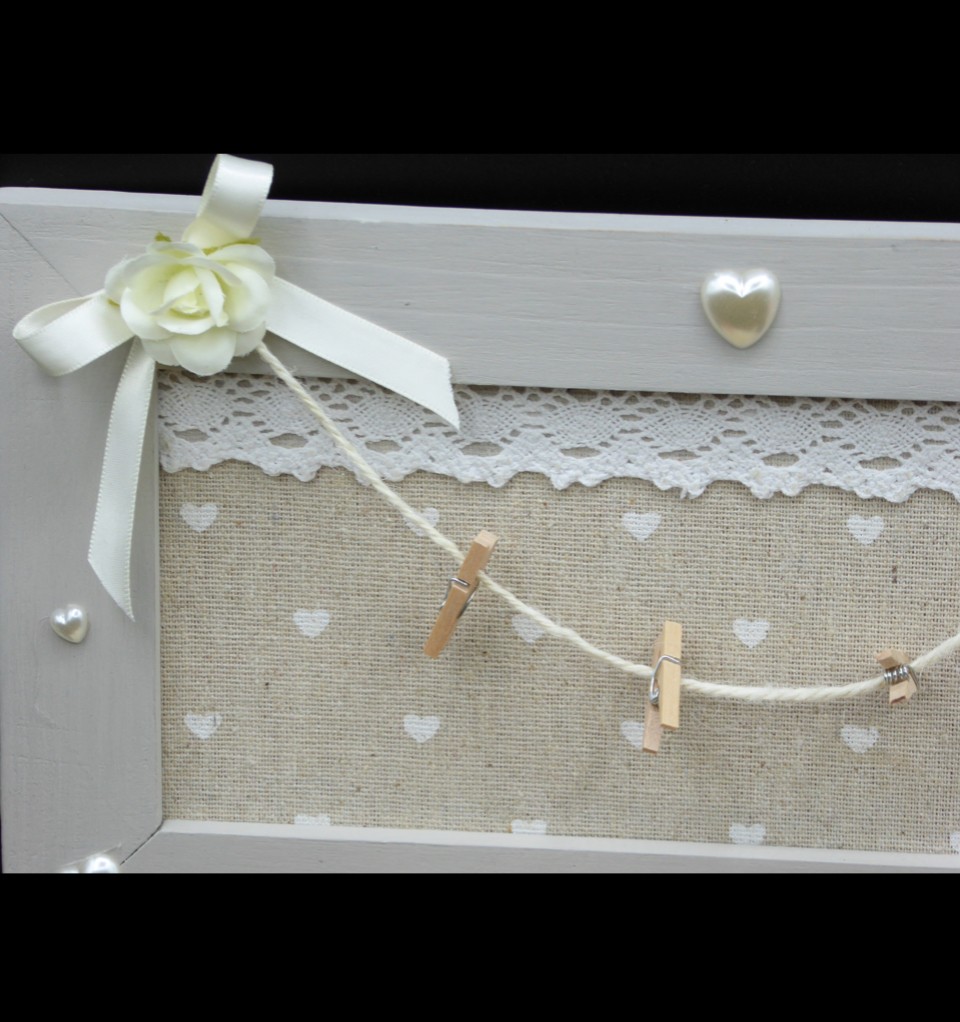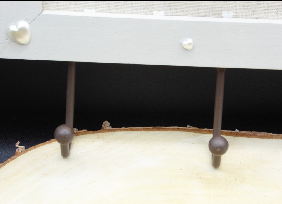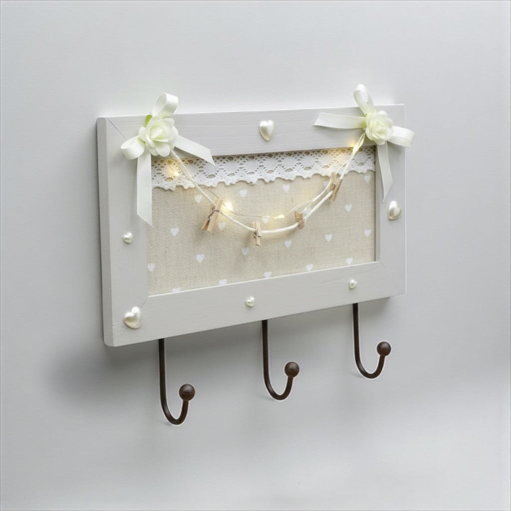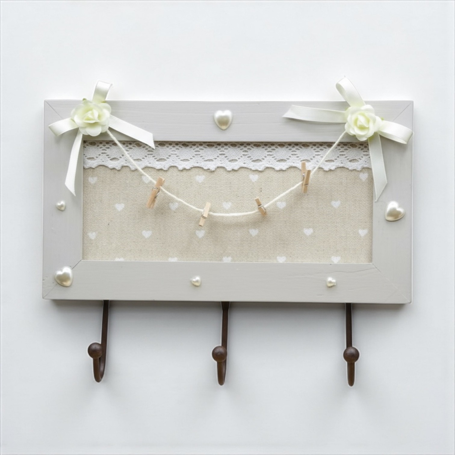 Ajoutez une touche de charme ancien à votre intérieur avec ce porte torchon ou porte-clés mural "Petits cœurs". Alliant esthétique romantique et fonctionnalité, ce modèle unique est conçu à partir de matériaux nobles et naturels : un cadre en bois peint en soie grège, un fond recouvert de tissu, dentelle en lin et coton, et une ficelle en jute.
