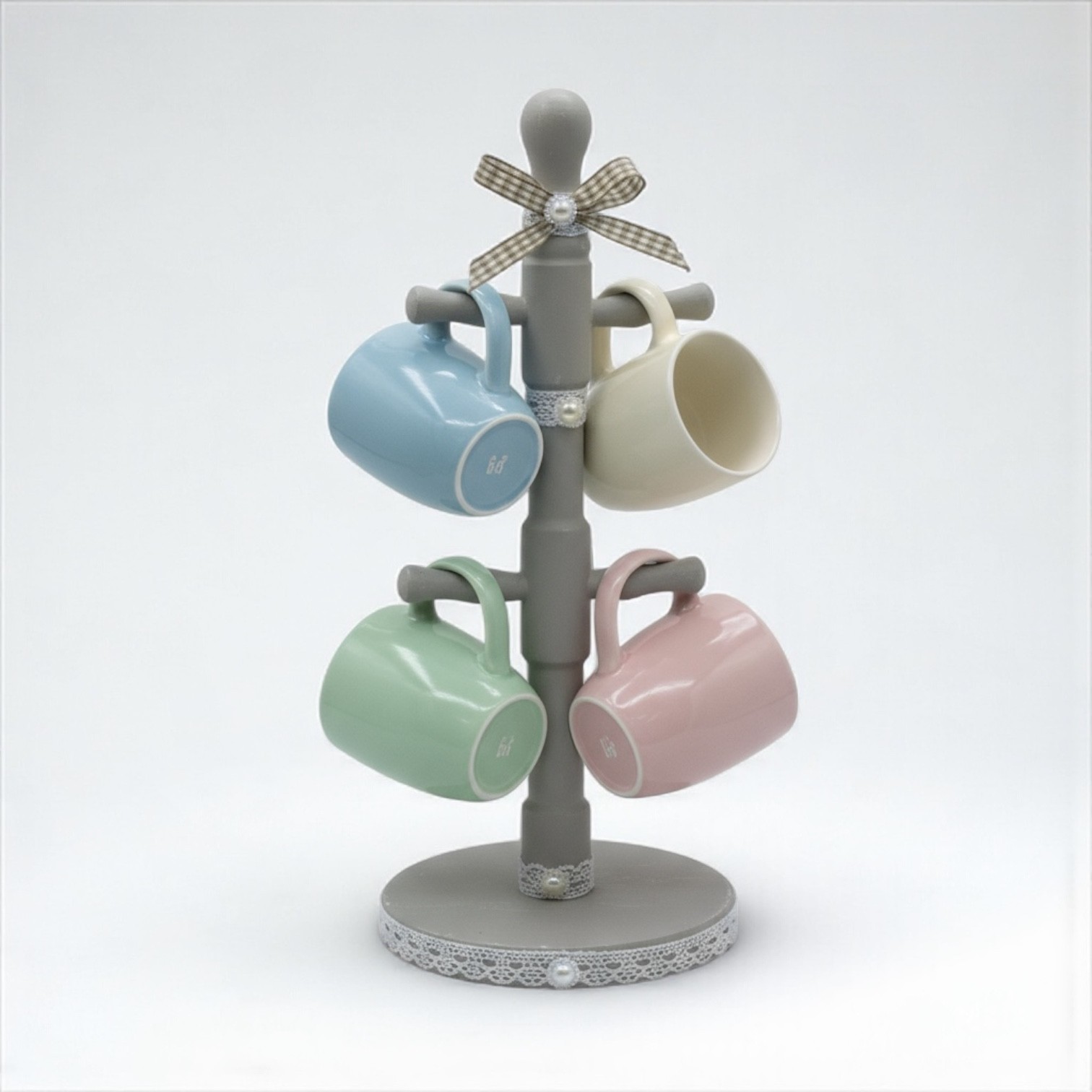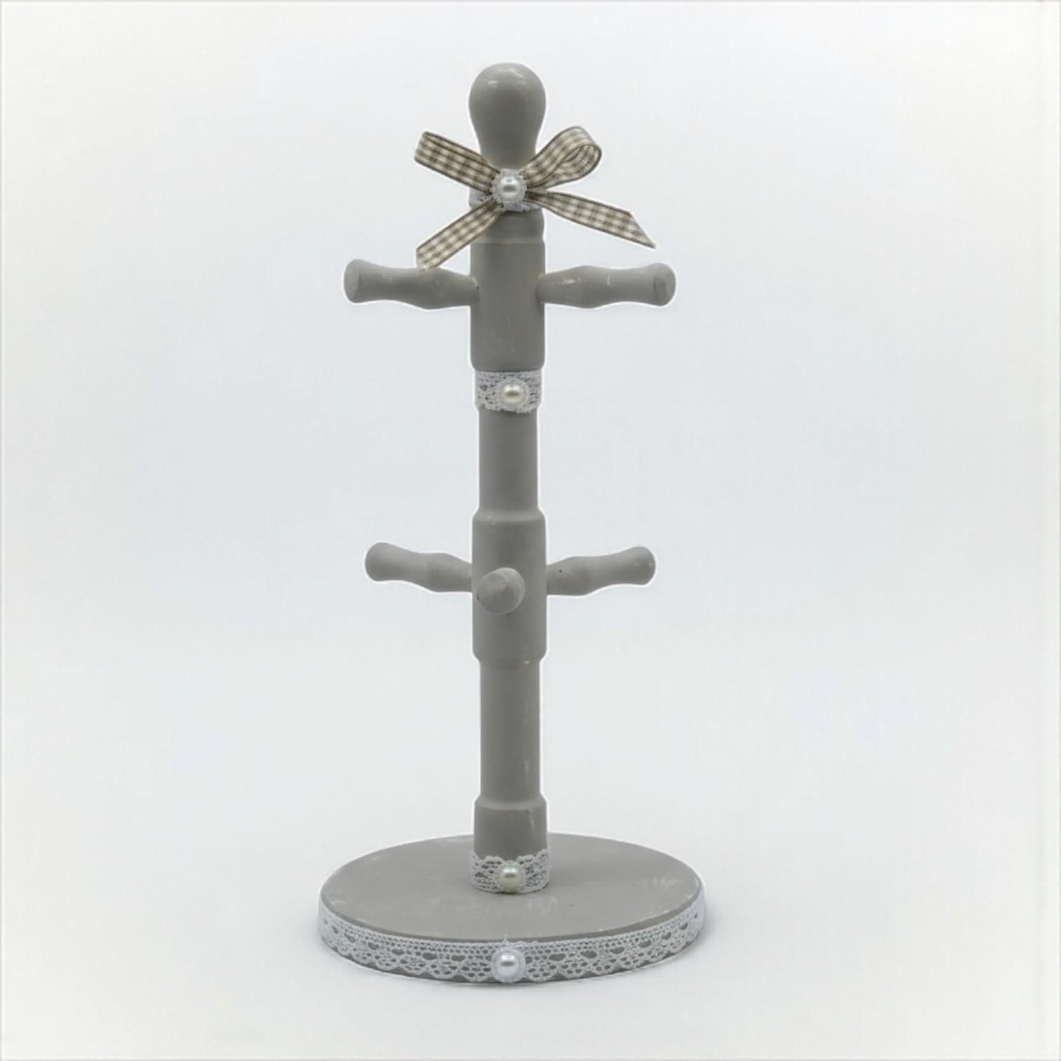 Apportez une touche d'élégance vintage à votre intérieur avec ce porte-tasses unique relooké dans un esprit maison de famille. Sa finition taupe patinée de blanc, ornée de dentelle délicate, d'applications en résine et d'un nœud vichy, en fait une pièce de charme idéale pour une décoration style campagne chic.