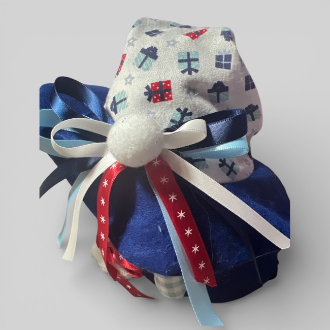 • Matériaux : feutrine, tissu imprimé de Noël, laine à feutrer, yeux expressifs et deux jolies tresses blanches.