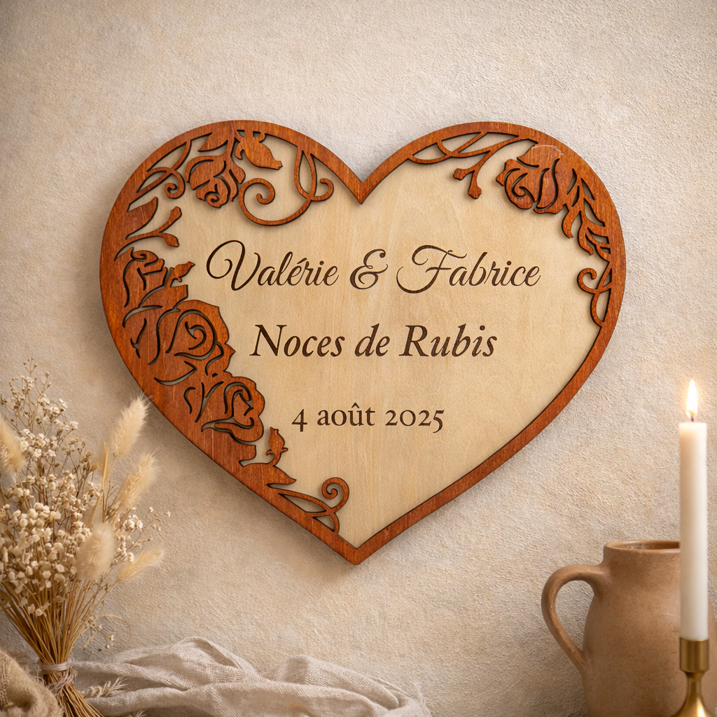 Idéal pour célébrer un anniversaire de mariage, des noces d’argent, d’or ou de rubis, ce cœur en bois personnalisé est un cadeau romantique et intemporel qui trouvera facilement sa place dans votre décoration intérieure.