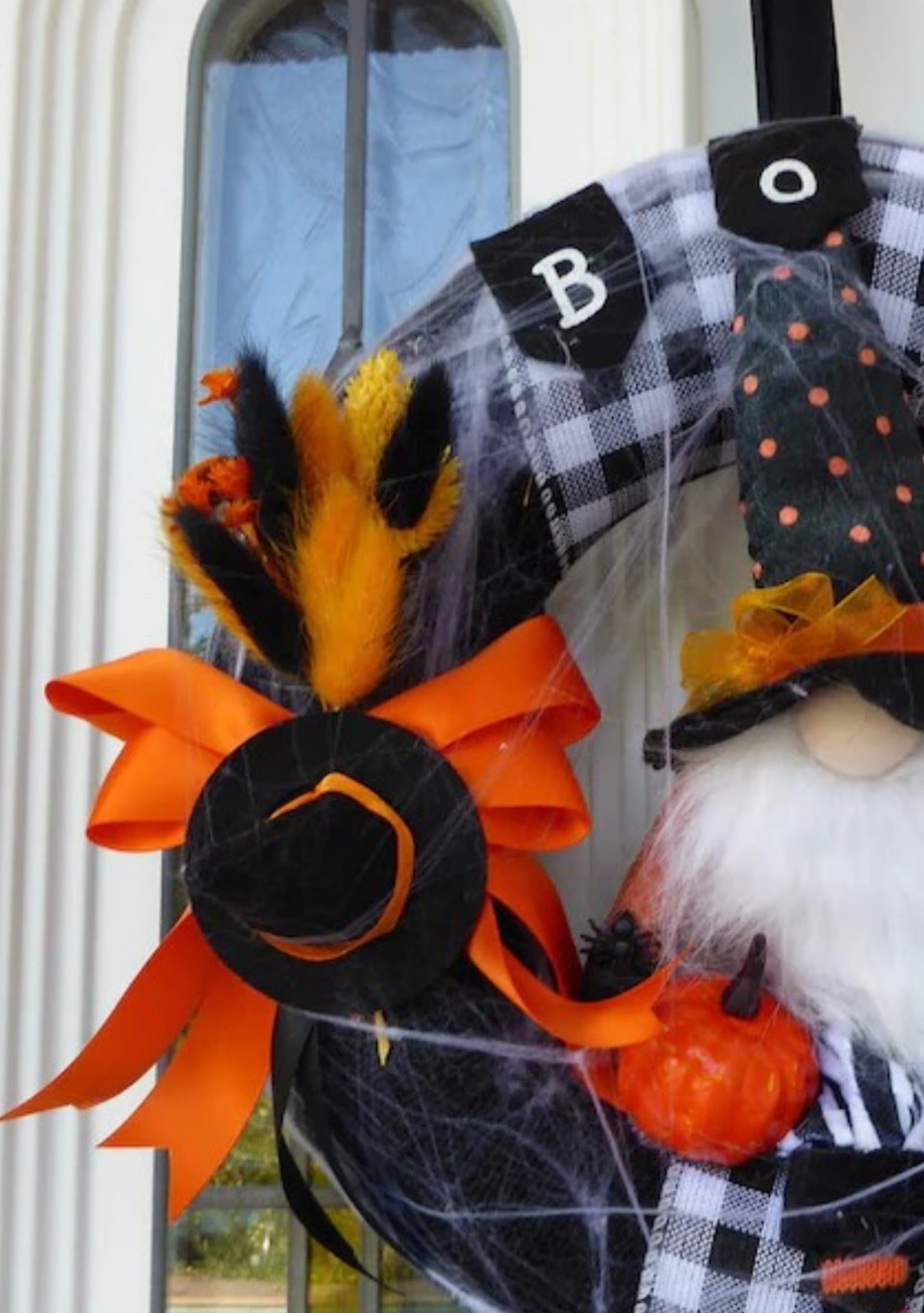 Chaque couronne intègre des détails emblématiques : mini citrouille, araignée, toile, fantôme, chapeau et un petit gnome de 30 cm assis au centre – signature de notre collection 2025.