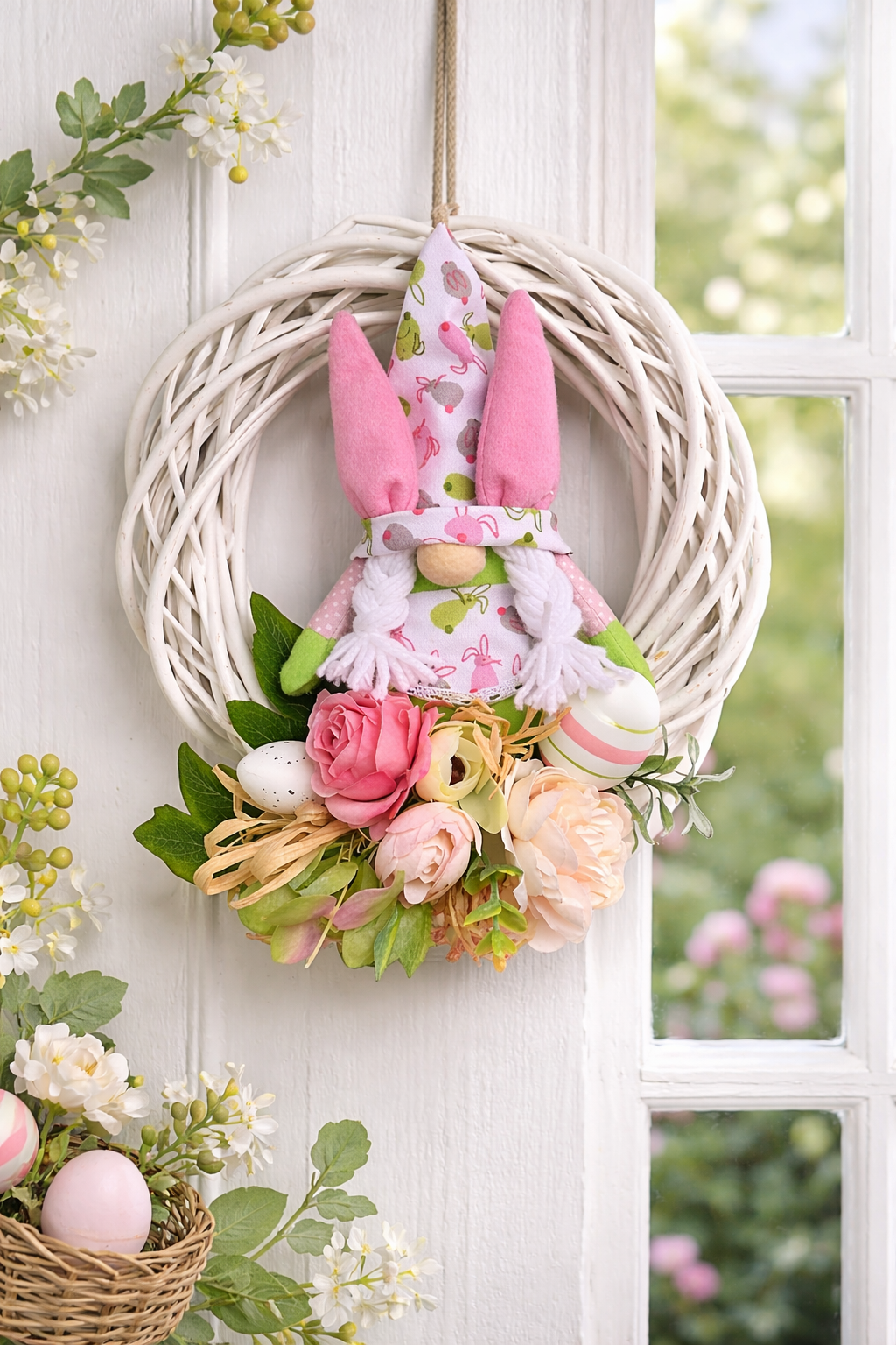Son gnome décoratif, ses fleurs délicates et ses œufs pastel créent une ambiance printanière chaleureuse et authentique.