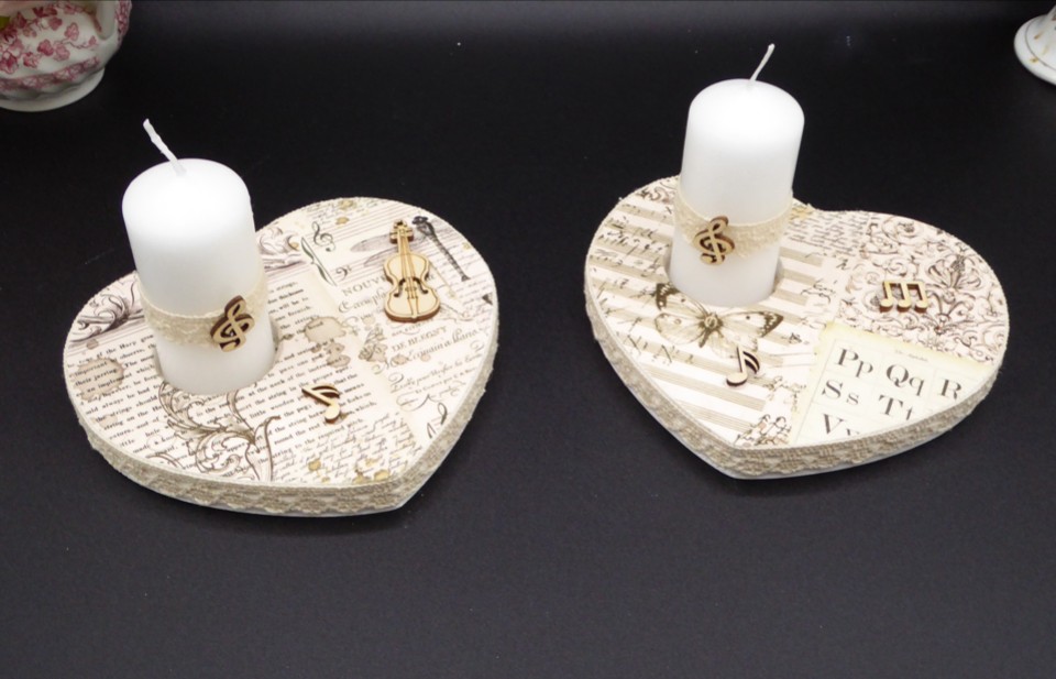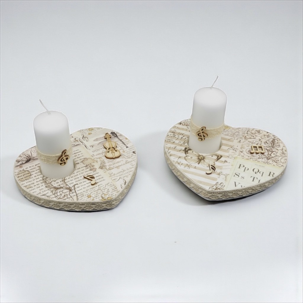 Apportez une touche d’élégance à votre intérieur avec ce duo de bougeoirs “Musique”, fabriqué à la main par L’Atelier du Val-Rousergue. Chaque cœur en bois est orné de papier de riz, de dentelle et d’un délicat motif musical pour une décoration romantique et poétique.