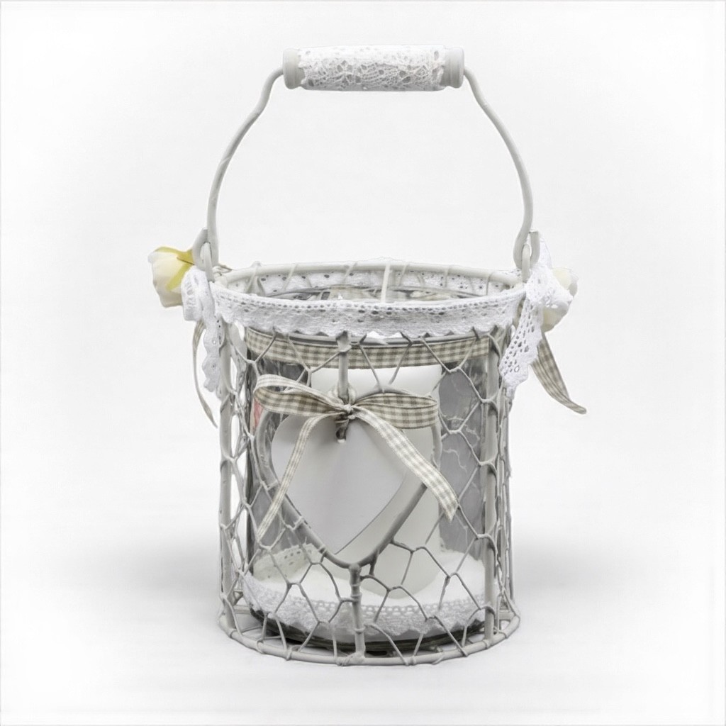 Cette lanterne vous accompagnera avec charme lors de vos soirées estivales ou sublimera votre intérieur tout au long de l'année. Peinte en soie grège et patinée en blanc colombe, elle est décorée avec soin de ruban vichy, de dentelle blanche, de fleurs en soie et d’un adorable cœur en bois blanc. Son verre est également orné de dentelle et ruban assorti pour un rendu délicat et raffiné.