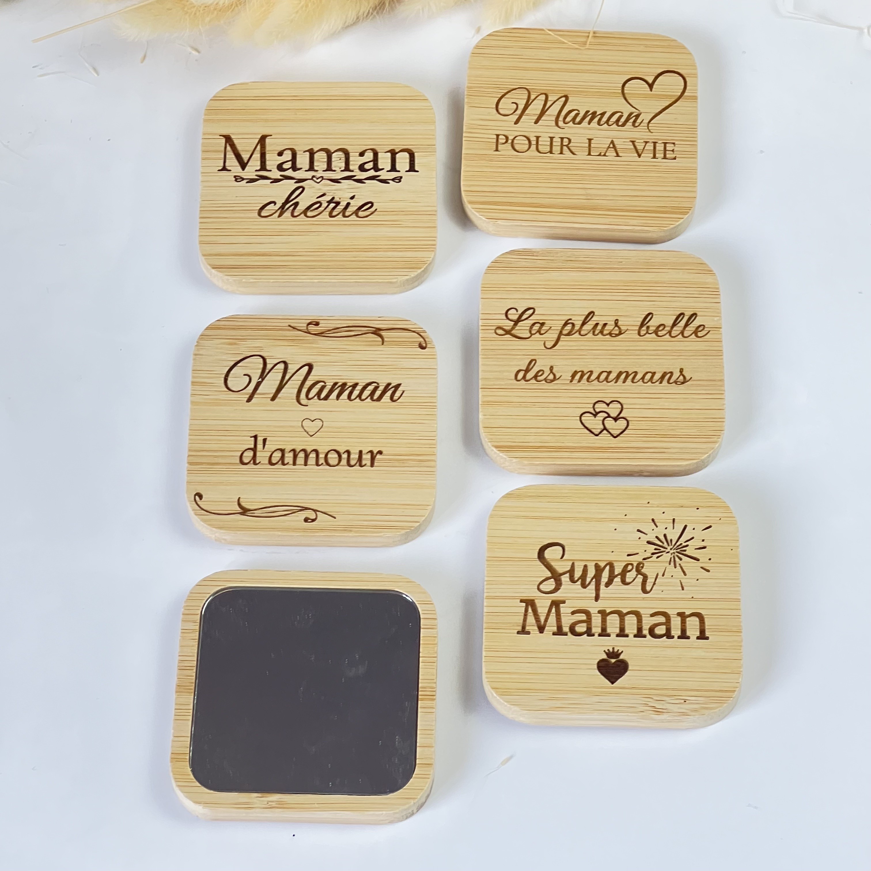Chaque miroir est décoré d’une gravure fine réalisée avec soin dans mon atelier. Les motifs et messages ont été pensés dans un style doux et bohème, parfait pour célébrer l’amour d’une maman.