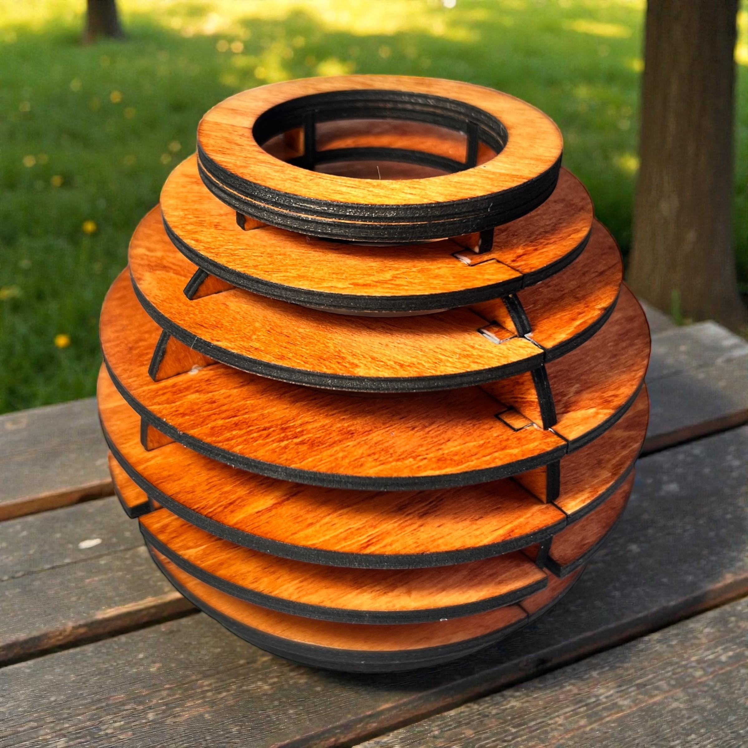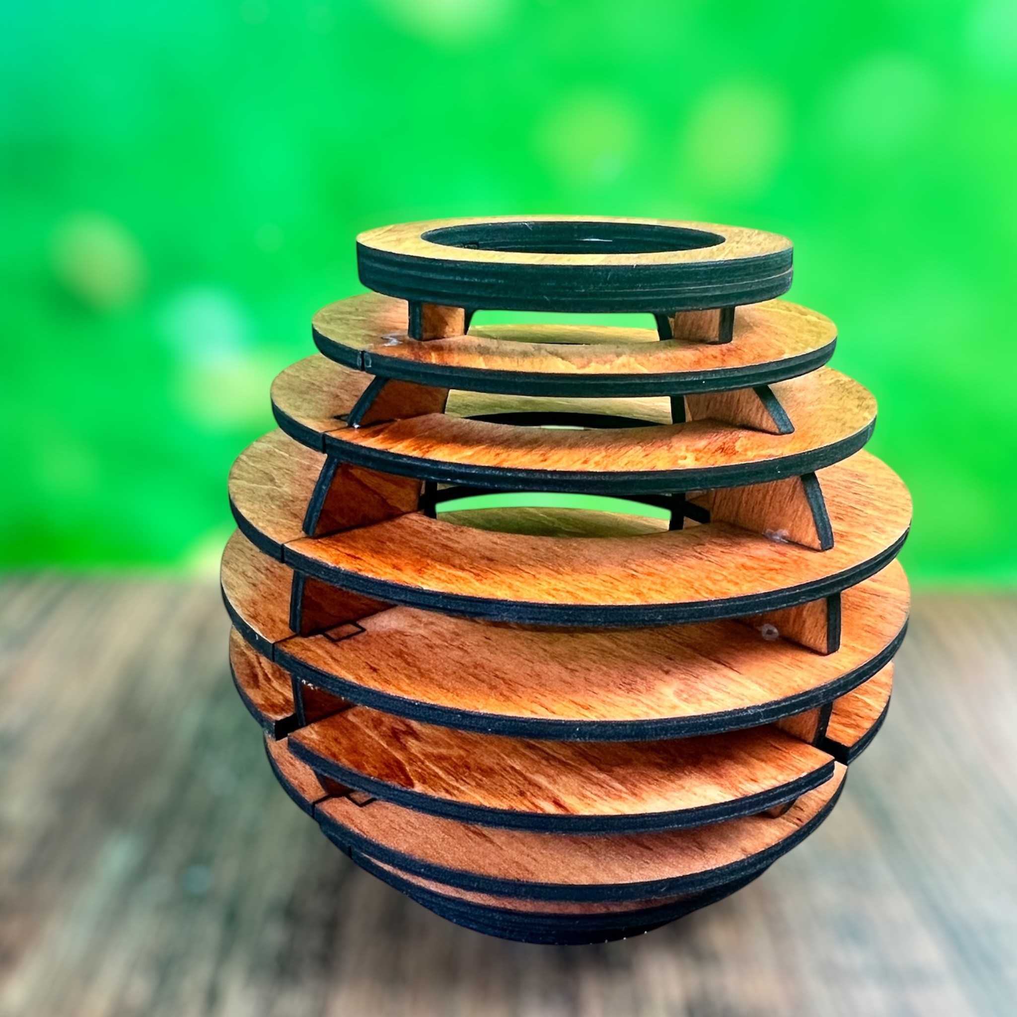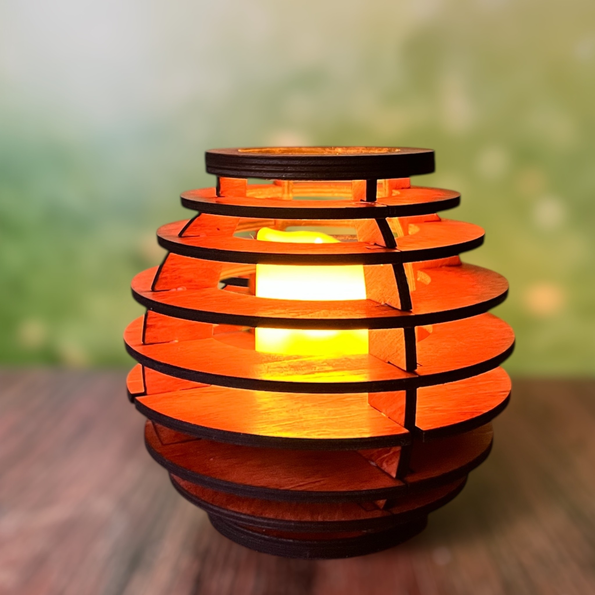 Chaque photophore est une pièce unique, façonnée à la main dans notre atelier. Découpé, poncé et assemblé avec minutie, il présente une finition couleur merisier qui ajoute une touche chaleureuse et authentique à votre décoration intérieure.