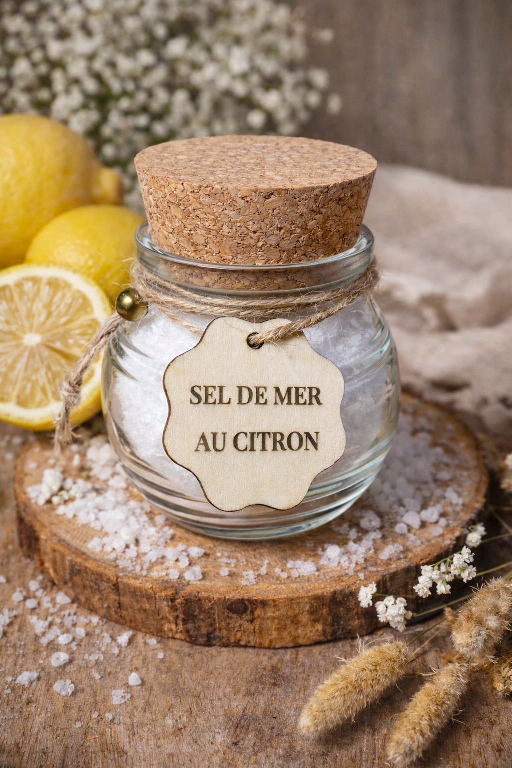 Chaque pot est soigneusement préparé à la main et présenté dans un pot en verre avec bouchon en liège, accompagné d’une étiquette en bois gravée, pour un rendu à la fois naturel et élégant.