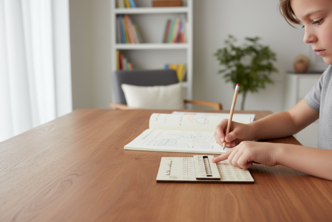 Grâce à la réglette mobile, l'enfant sélectionne la table souhaitée et visualise instantanément tous les résultats. Une méthode inspirée de la pédagogie Montessori pour apprendre en toute autonomie.