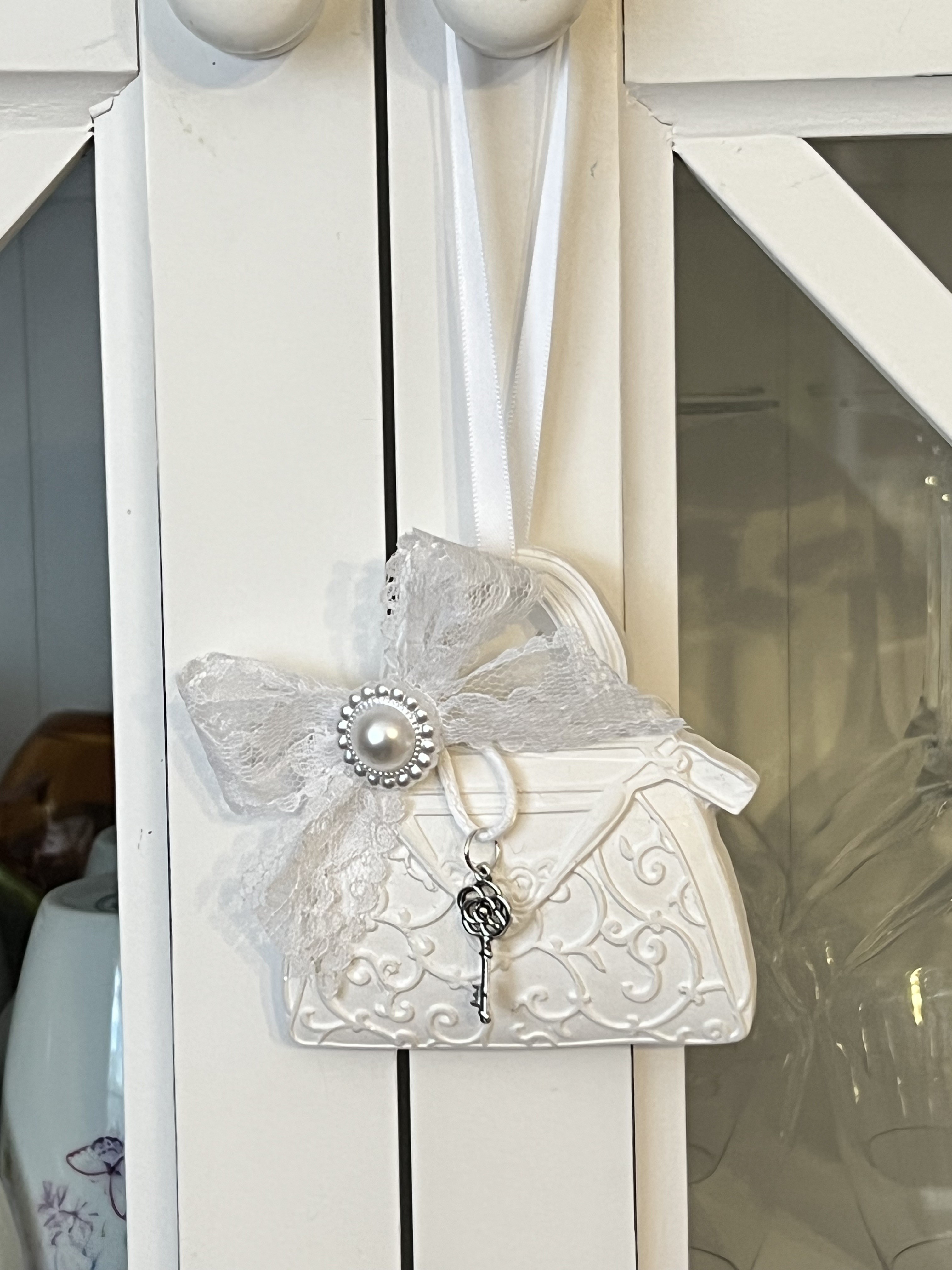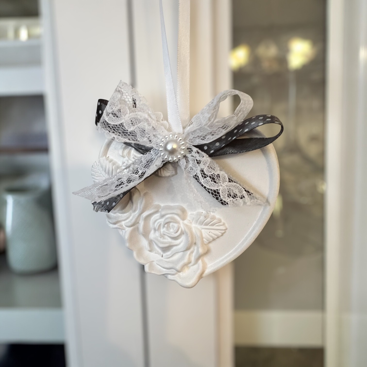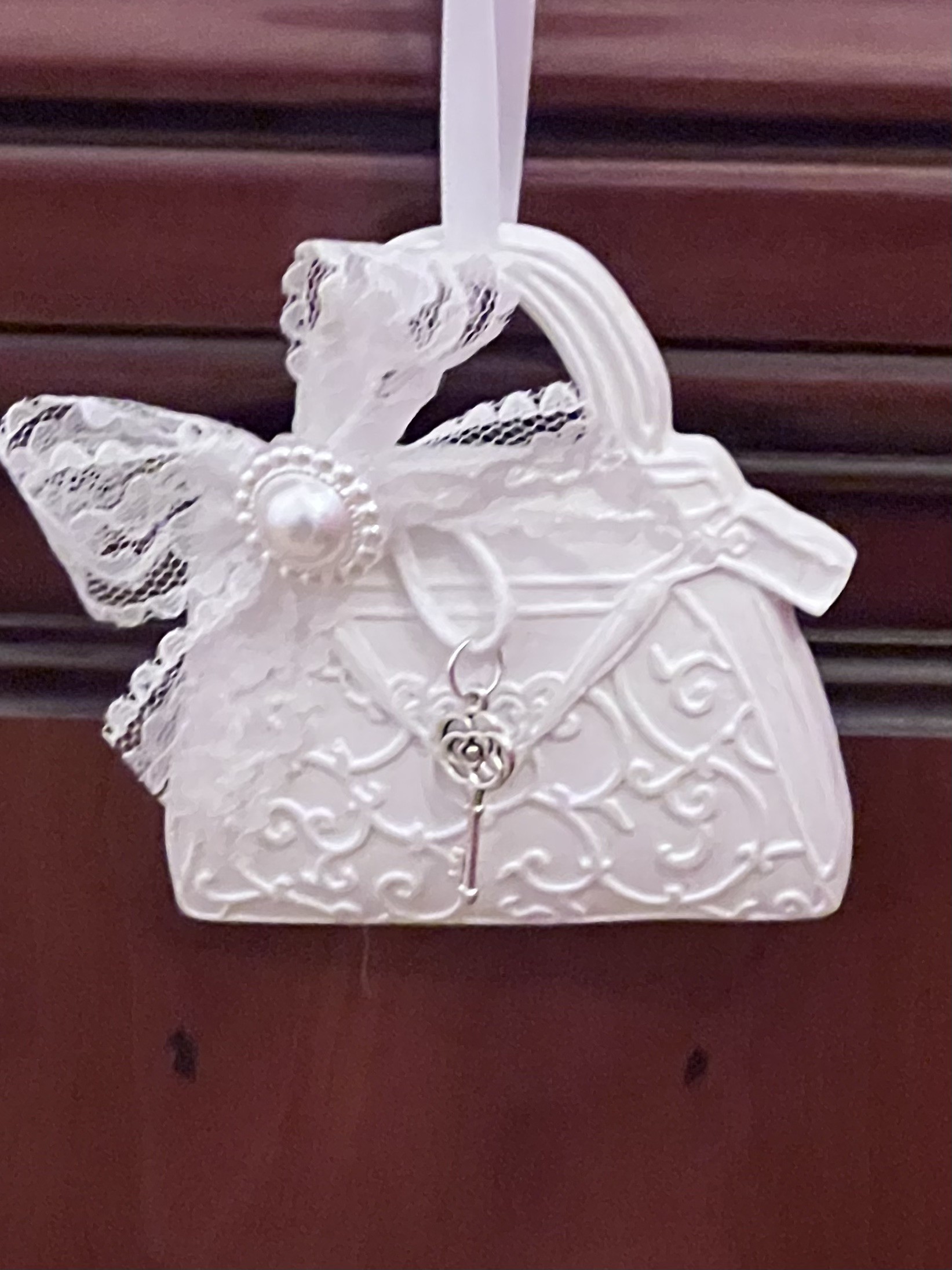 Chaque diffuseur est coulé, décoré et assemblé à la main, dans un esprit shabby chic romantique. Les breloques et décorations textiles peuvent varier légèrement, rendant chaque pièce unique.