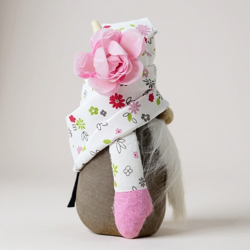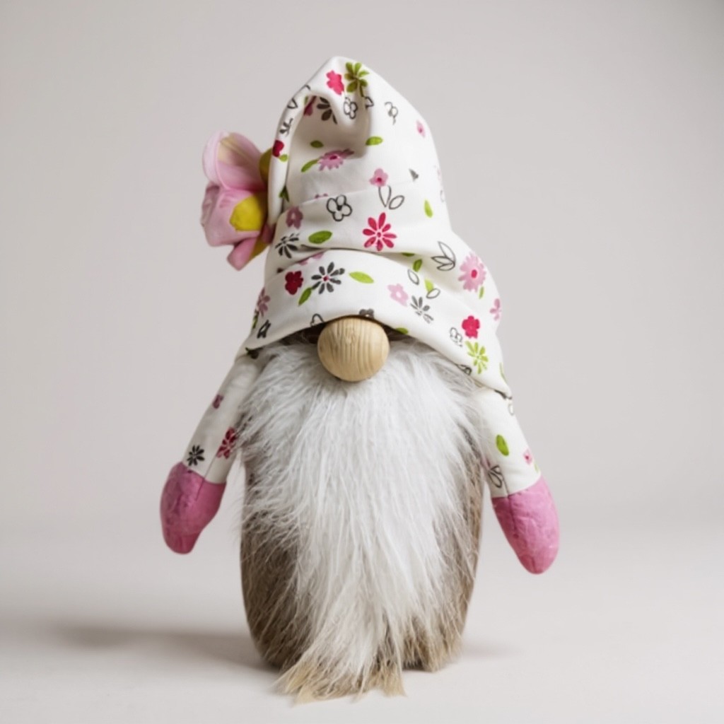 Craquez pour ce gnome décoratif taupe et rose entièrement fait main, parfait pour apporter une ambiance chaleureuse et poétique à votre intérieur.