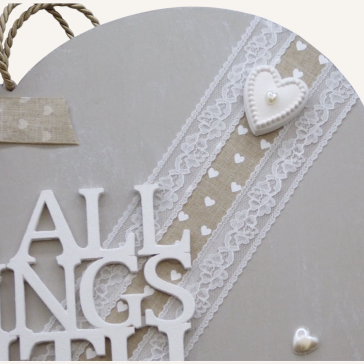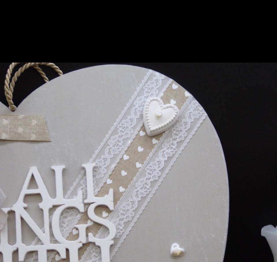- Matériaux : bois peint et patiné, dentelle, ruban en lin, fleurs en soie, rubans organza, plâtre