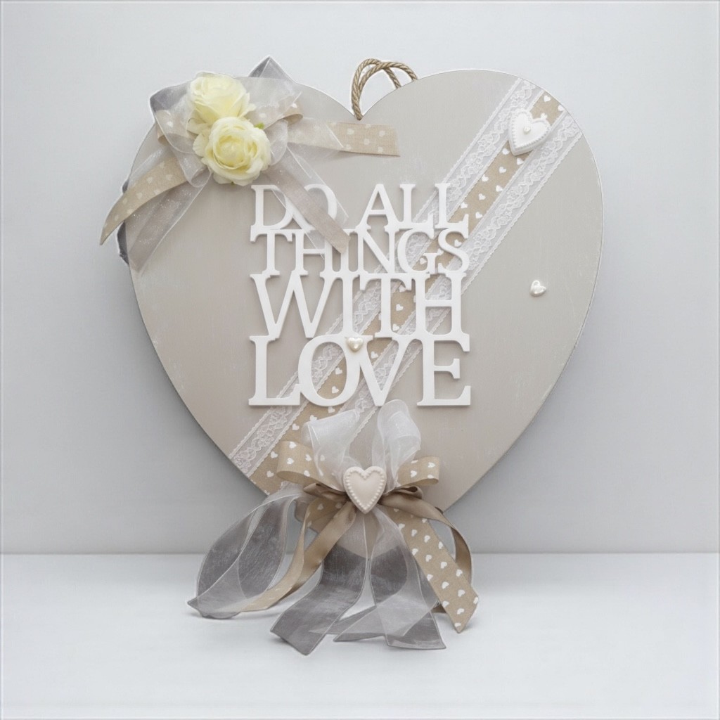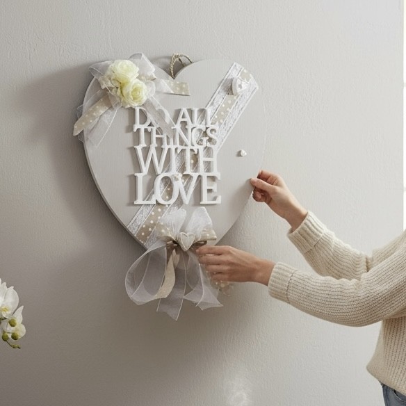 Associez ce cœur mural à des bougies blanches, textiles en lin naturel et cadres photo vintage pour une ambiance shabby chic ou romantique dans votre chambre, salon ou entrée.