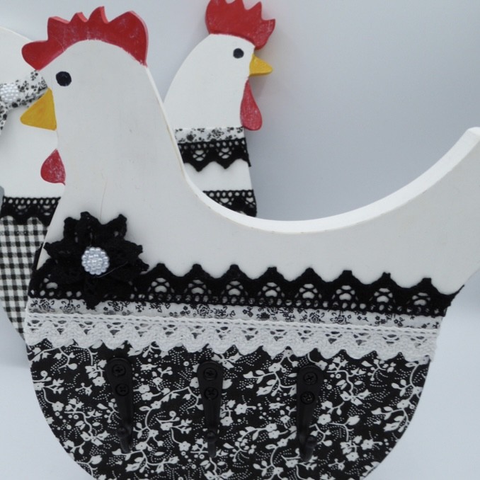 Chaque pièce est réalisée à la main à partir de bois massif de 2 cm d’épaisseur. Peint et patiné en blanc cassé, décoré de tissu et de dentelle, il est doté de 3 crochets vissés et d’un système d’accroche mural.