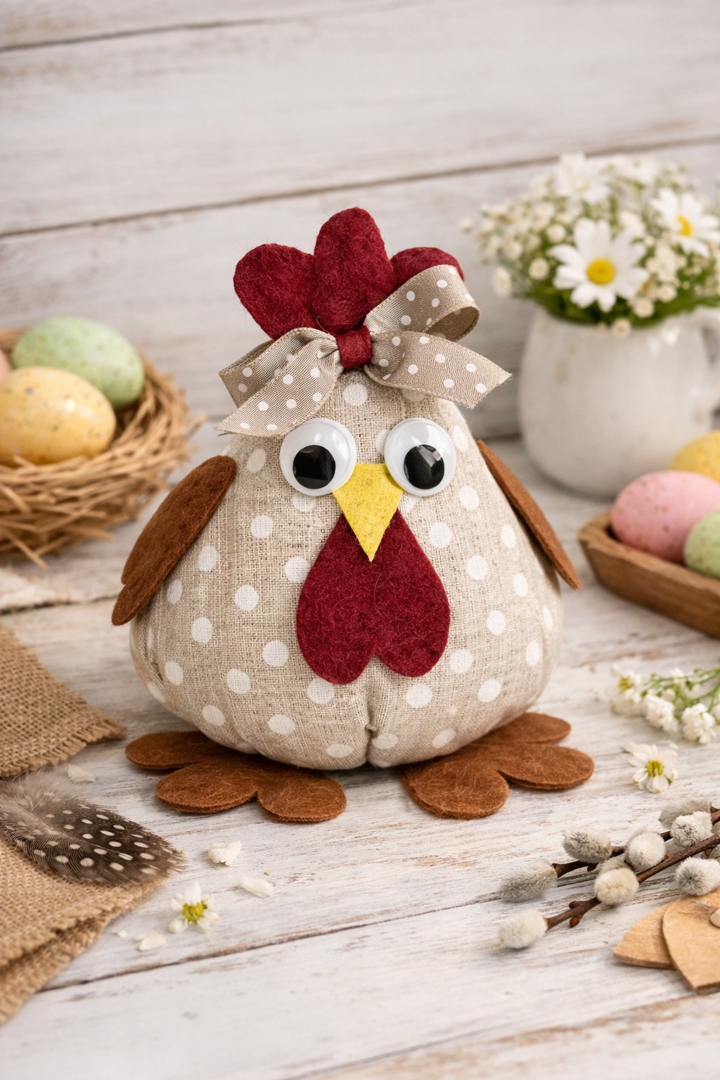 Cette poule décorative en tissu lin à pois, entièrement réalisée à la main dans mon atelier, apportera une touche chaleureuse et authentique à votre décoration de printemps.