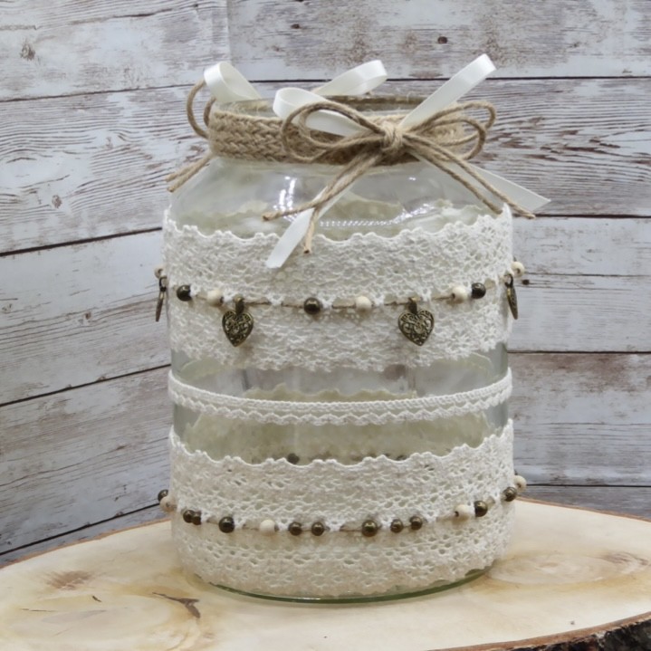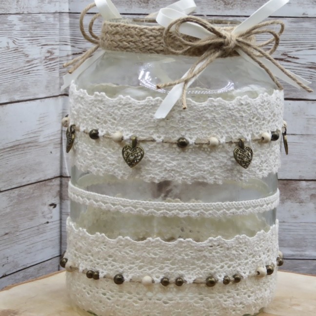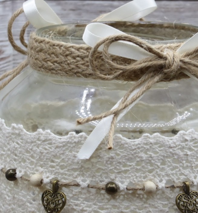 - Matériaux : verre, dentelle de coton, jute, perles et métal