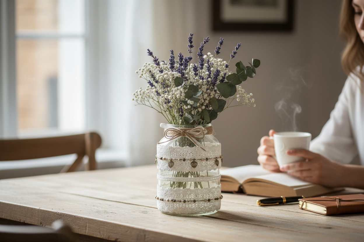 Apportez une touche d’authenticité et de douceur naturelle à votre décoration de table avec ce vase champêtre signé L’Atelier du Val-Rousergue. Décoré de dentelle beige, de perles en bois et métal, et de ruban de jute, il crée une ambiance romantique et rustique parfaite pour vos mariages, baptêmes ou décorations de maison.